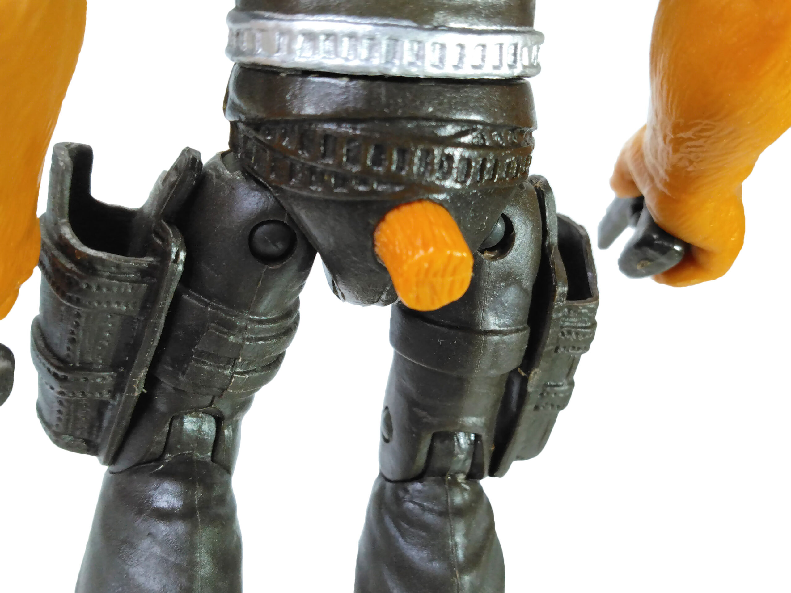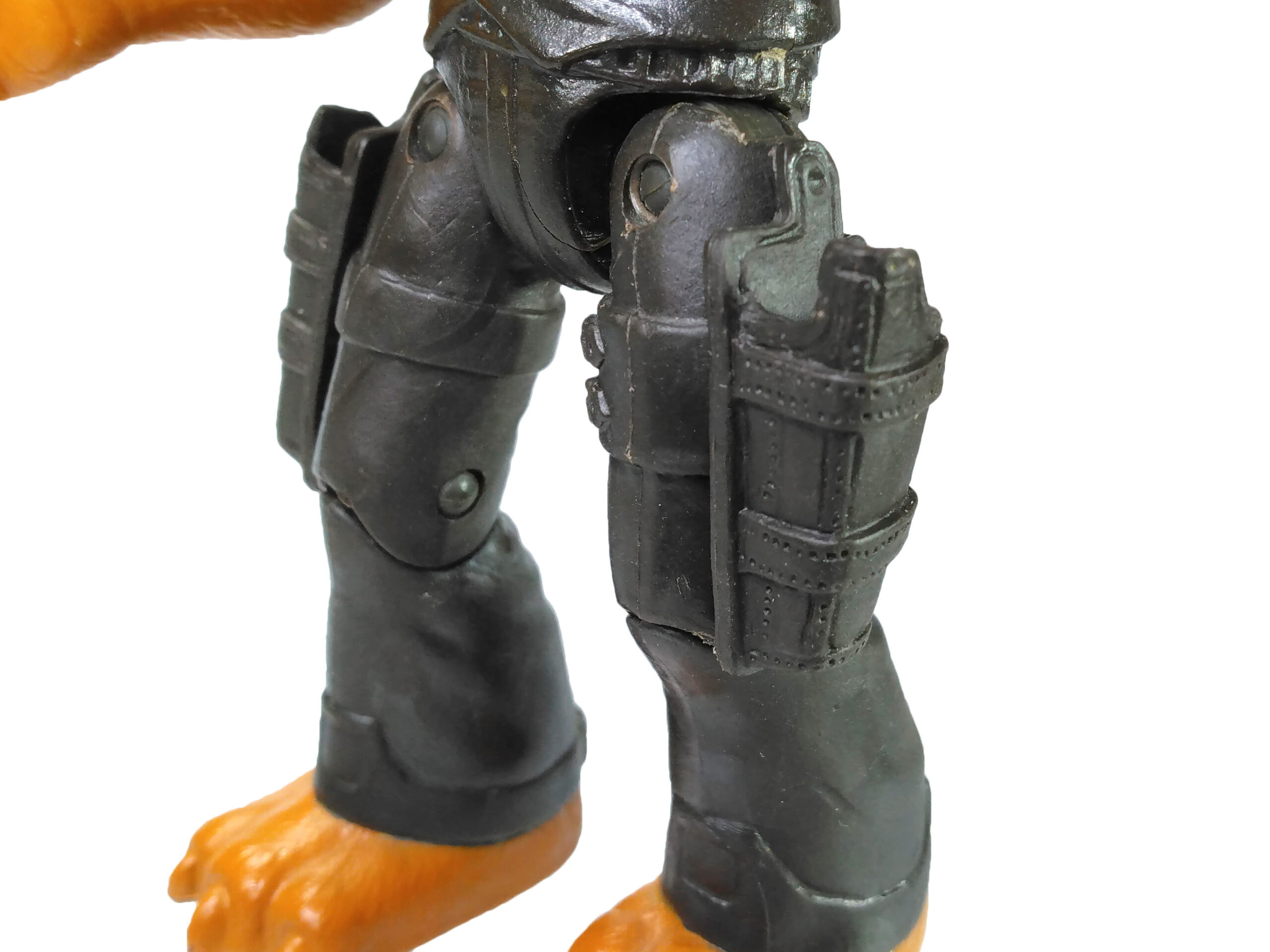 Le bassin est articulé par le binôme vis et demi-disque et les genoux permettent de fléchir les jambes du personnage. Cette articulation est rendue presque inutile du fait du pied gauche de la figurine, légèrement plié. Sa stabilité s’en retrouve donc compromise.