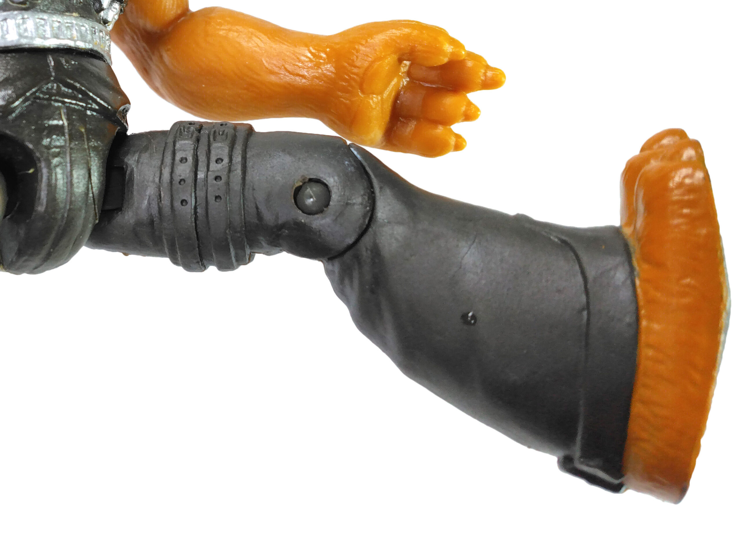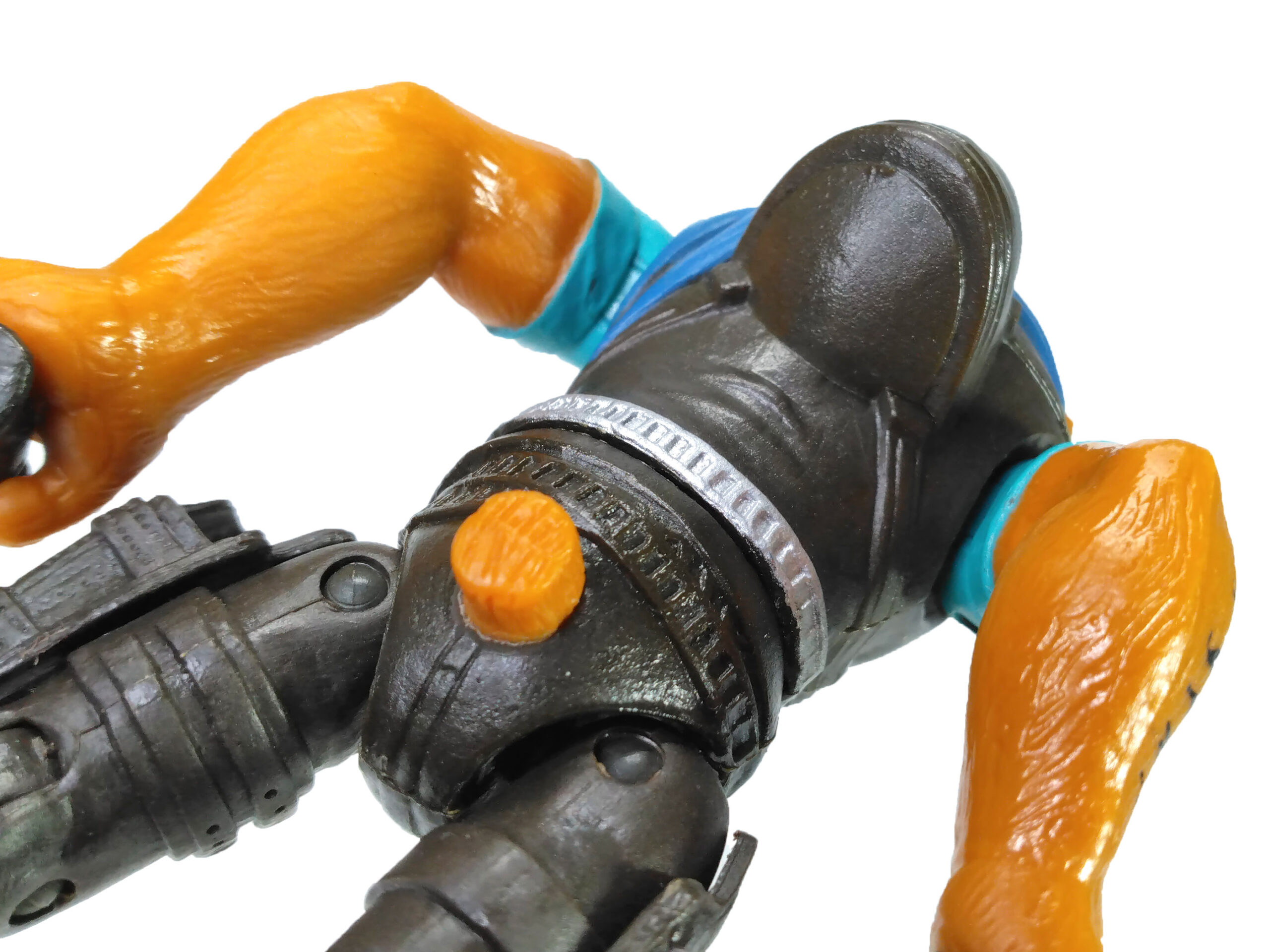 Les articulations de la figurine sont tout à fait classiques pour une figurine Playmates Toys, avec une tête articulée par une vis au niveau du coup. Ses bras ne bougent qu’au niveau des épaules par une vis et un demi-disque. Malheureusement, il n’est pas possible de plier les bras, condamnés à rester dans une posture dynamique étrange en l’absence d’armes.