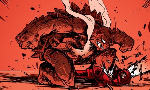Raphael avait conscience d’avoir commis une terrible erreur en aidant Hob (TMNT #99). Même si le chat était décidé à passer à l’attaque, avec ou sans lui, il l’avait aidé. Alors que Leonardo cherchait à le rassurer, Bishop se releva et frappa Jennika d’une décharge électrique, tandis que Casey essayait de raisonner son père. Les deux frères fondirent sur l’agent de l’EPF, dont le bras droit fut totalement sectionné par Leonardo. Raphael fut arrêté par l’un des clones de Slash. Casey se jeta son père, et d’un coup de poing, décrocha ses lunettes de contrôle. Bishop détestait seulement une chose plus que les monstres et les mutants ; c’était la trahison de la famille. Il dirigea son dernier bras en direction de Casey et lança une nouvelle boule électrique. Si Hun était contre les mutants, il aimait toujours son fils et s’interposa, prenant la décharge de plein fouet. Le colosse s’écrasa au sol. Dommage collatéral. Leonardo était également au sol, tenu en joue par Bishop, qui s’apprêtait à l’exécuter à son tour. C’est alors que le dernier clone encore en vie eut une vision, un souvenir. Celui d’un Slash qui s’était élancé sur Wayne Bishop alors en chaise roulante (TMNT #70). Il avait des visions du mutant originel, une bribe fugace qui en disait long. Soudain, le clone se lança sur Bishop et l’écrasa de tout son poids, de la même manière. Le corps androïde de Bishop était réduit en miettes. Celui de son pilote ne devait guère être différent. Le mutant s’effondra, frappé par la décharge destinée à Leonardo, en détruisant le monstre de l’EPF.