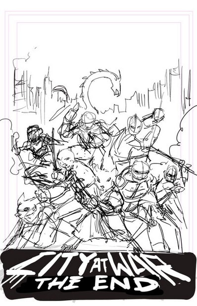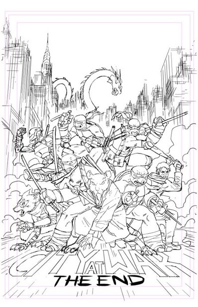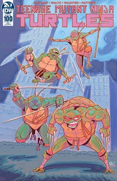 - En guise d’hommage pour ce centième numéro, quelques anciens dessinateurs sont revenus le temps d’une page. Ainsi, Dan Duncan, qui avait dessiné les 12 premiers numéros, en plus de quelques autres mini-séries, revient pour la page 26. Adam Gorham, que l’on avait pu découvrir sur Metalhead 2.0, puis sur Ghostbusters / TMNT et Cory Smith, pour l’épilogue. Mateus Santolouco est également revenu, mais uniquement à travers des images provenant d’anciens numéros. Enfin, Dave Wachter et Michael Dialynas, qui ont beaucoup dessinés pour cette deuxième grande partie de l’aventure IDW (TMNT #51-100) se partagent la plupart des pages. Les deux dessinateurs avaient travaillés ensemble sur cet arc de City at war.