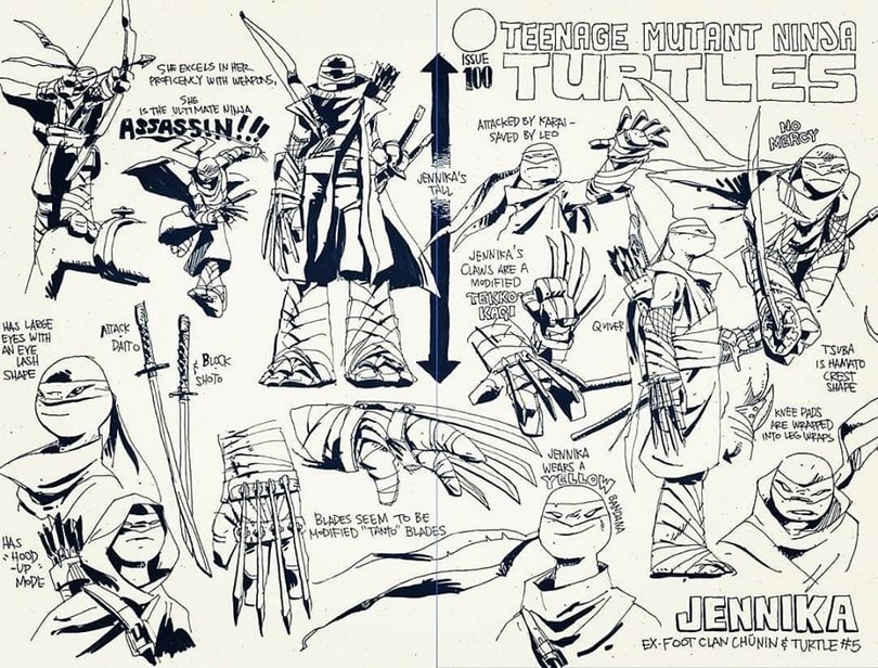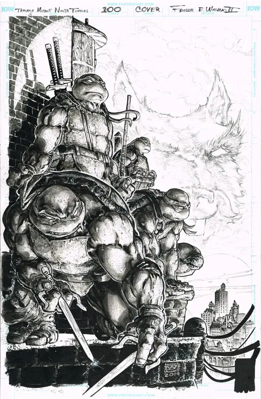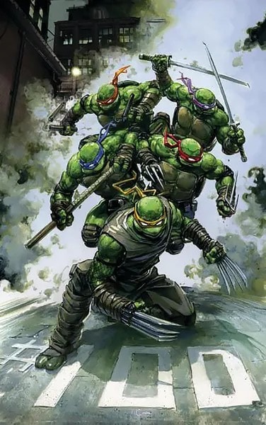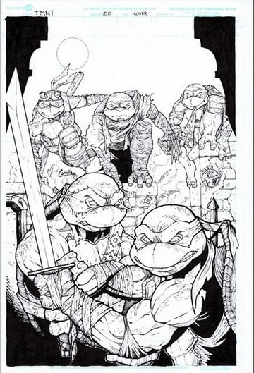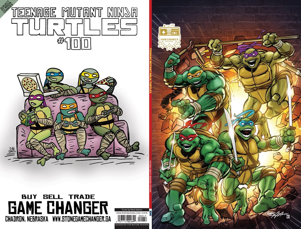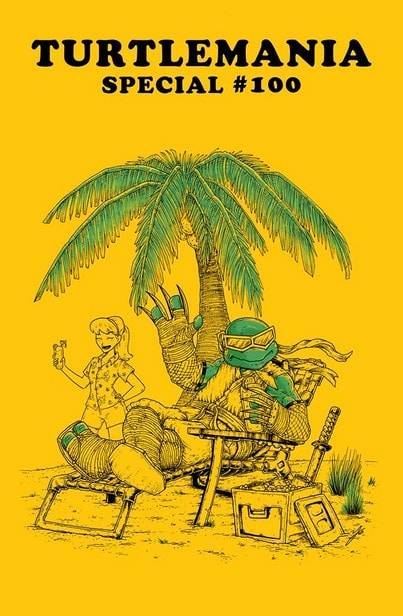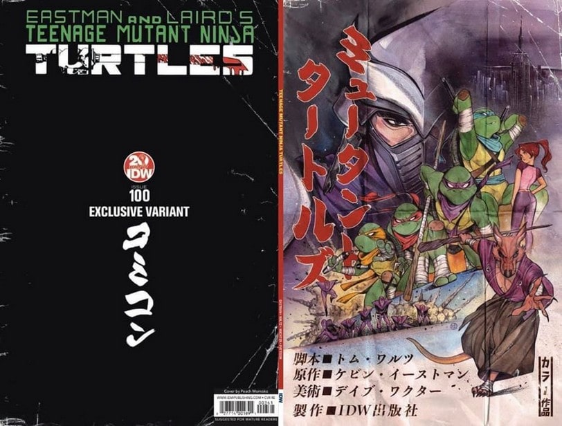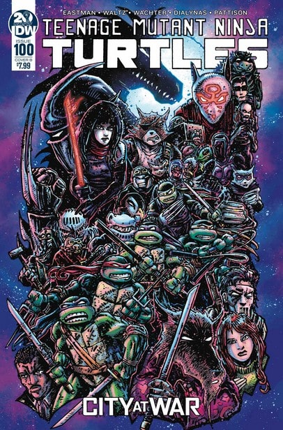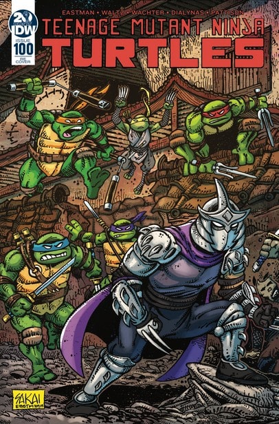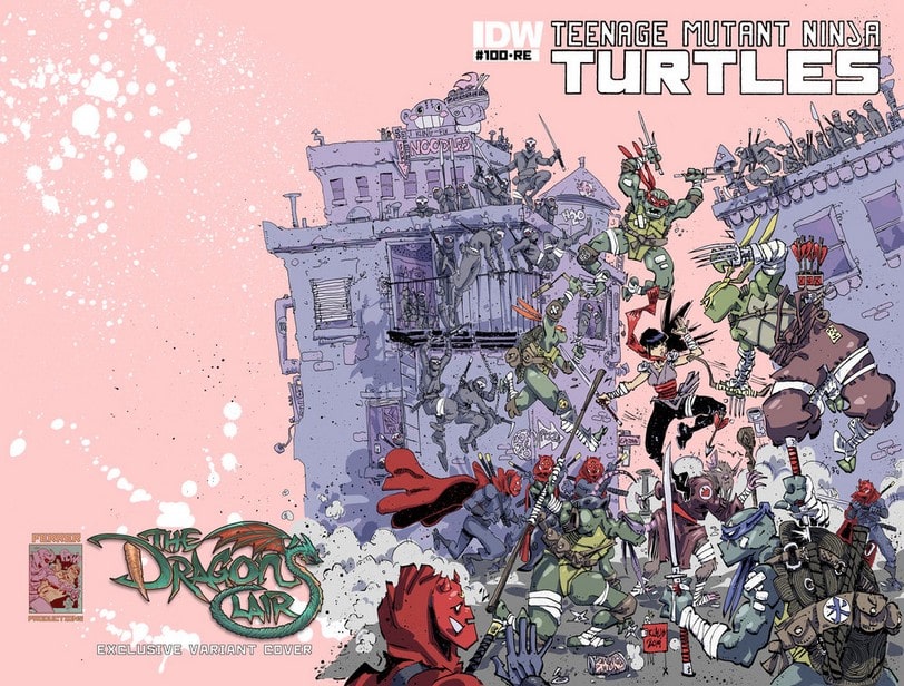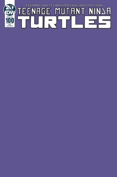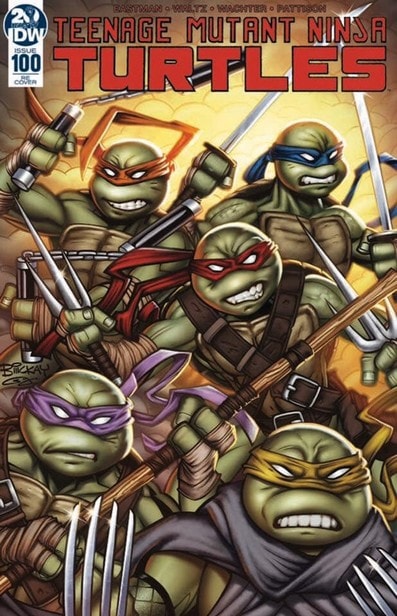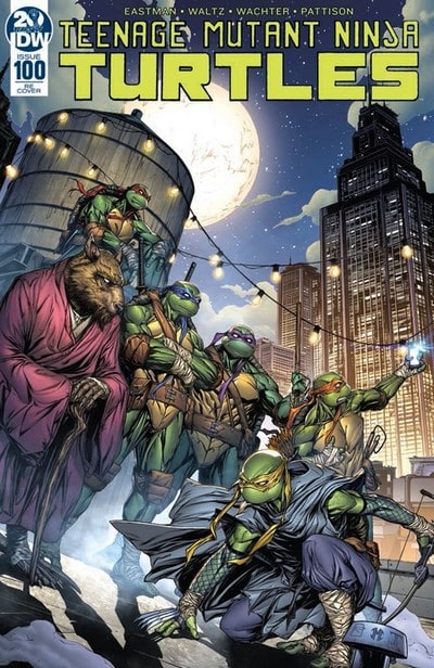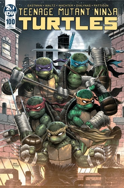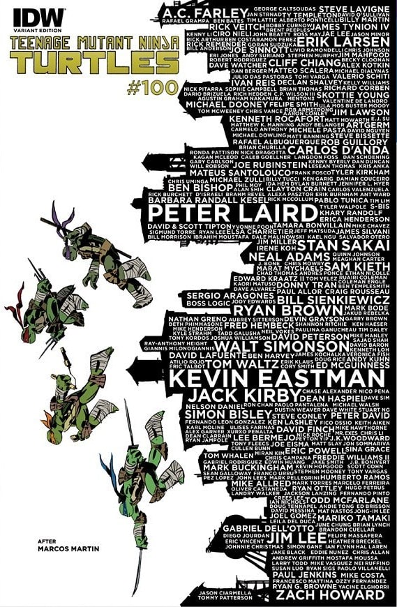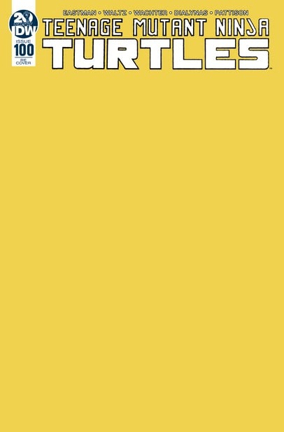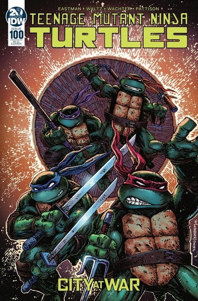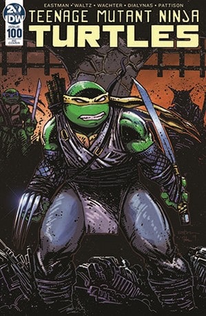 C’est la première fois qu’un comic TMNT atteint uniquement à travers son ongoing le centième numéro. Pour célébrer cet évènement, de nombreux artistes ont été appelés pour réaliser un très grand nombre de variants covers (voir ci-dessous). De plus, une version deluxe hard cover est sortie en janvier, reprenant la totalité du TMNT #100, et en y ajoutant un grand nombre de bonus, comme des dessins préparatoires et des commentaires pour le montage de ce numéro.