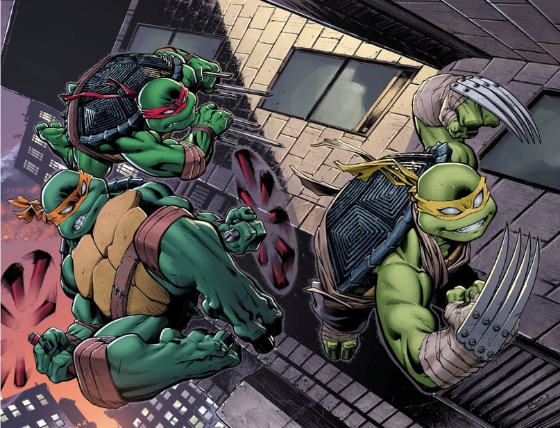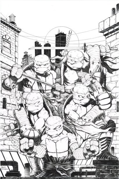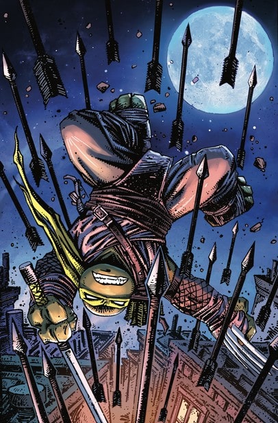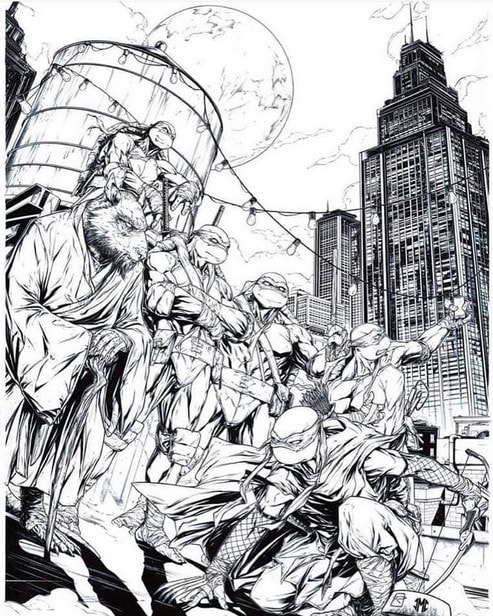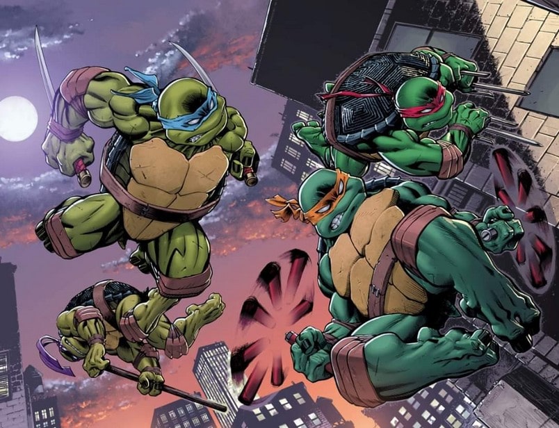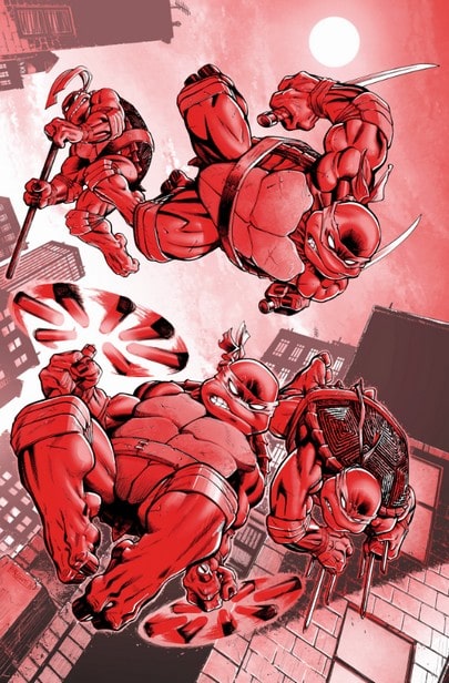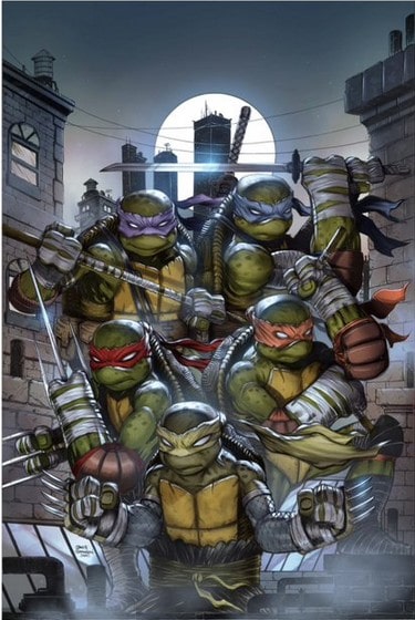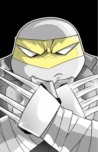 - La couverture d’InHyuk Lee est la dernière d’un quadriptyque partagé avec les artistes Alan Quah et Kael Ngu, qui retrace une scène d’action toutes les trois secondes, amenant à sa conclusion dans le TMNT #100.