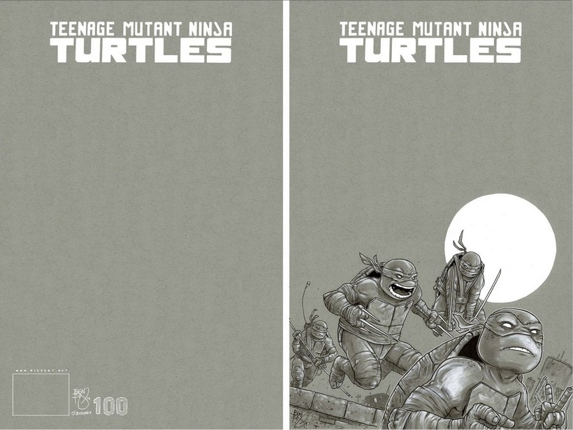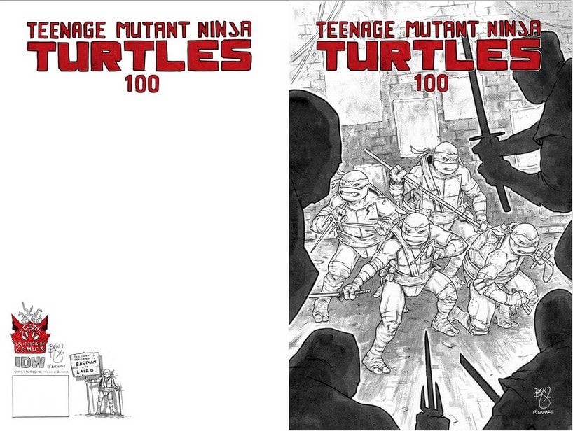- Pour l’évènement, le site de référence en comics TMNT, tmnt-ninjaturtles.com a décidé de lancer deux couvertures exclusives, à 75$ pièce et limitées à 250 exemplaires (une de chaque par personne). Chaque exemplaire est accompagné d’un certificat d’autenticité numéroté à la main et d’une signature des artistes et de Rich Horn, propriétaire du site. Au dos de ce certificat, Rich a veillé à intégrer une chronologie du TMNT #1 jusqu’à ce TMNT #100. Un très beau travail, de longue haleine, lorsque l’on connait la grande richesse de cet univers et de ses nombreuses aventures. Ces couvertures sont une interprétation des deux artistes du séjour des tortues à Northampton et de la couverture du TMNT (Vol. 1) #13 (l’une des préférées de Rich).