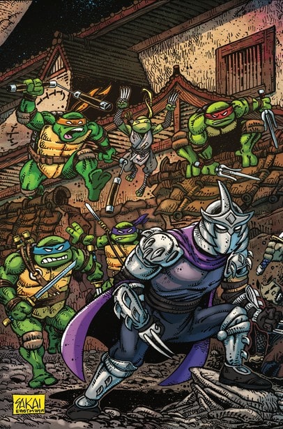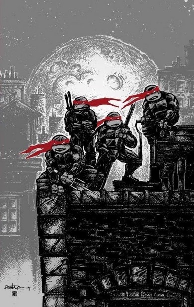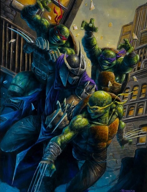 - Lorsque Splinter appel ses fils pour se rallier à lui, Raphael s’écrie que c’est sur le toit, encore une fois, que le combat final aura lieu. Il est vrai que dans l’univers des Tortues Ninja, les combats les plus importants se sont toujours déroulés sur des toits, depuis la première rencontre entre les tortues et Shredder dans le comic originel, jusque dans les séries de 2003 et de 2012, en passant par les films de 1990 et 2014. Dans cet univers, le combat à mort contre Shredder s’était déjà déroulé sur ce même toit, dans le TMNT #50.