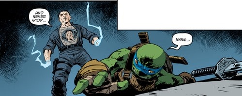 Dans le quartier général du Foot Clan, Leonardo livrait bataille à Bishop. Grâce à sa force robotique, l’homme brisa l’une des lames de la tortue. Avec son second sabre, le mutant coupa ses bras. Pathétique. Leonardo avait déjà réalisé cela par le passé (TMNT #70). Le corps androïde de Bishop avait été amélioré depuis cet incident, prenant en considération ses faiblesses. Un torrent électrique sorti des bras, transformés en canons, et jetèrent au sol la tortue, surprise. N’attendant pas que le mutant se relève, il lui asséna plusieurs coups, profitant de son affaiblissement. La peau du visage robotique s’ouvrit, laissant apparaître son crâne de métal et des yeux qui commençaient à scintiller.