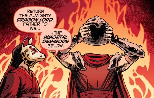 Il ne manquait plus qu’un seul élément pour que le Dragon puisse sortir totalement de son enfer ; verser le sang de l’héritière du guerrier Dragon, Karai. Déposée sur l’autel, Kitsune brandissait un poignard, qu’elle abattit sur la jeune femme. À l’aide de son kama, Alopex l’arrêta à temps et l’envoya au sol d’un coup de poing, avant d’extraire Karai du toit. La sorcière ordonnait à Shredder de la débarrasser de la mutante et de ramener son héritière. L’homme en armure, dont la tête faisait toujours défaut, leva la main et invoqua une armée de démons, qui sortit du portail.