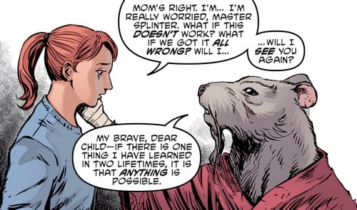 - La première page de comic reprend un grand nombre d’illustrations déjà utilisées dans des numéros précédents. Splinter en train de méditer (Mateus Santolouco) vient de la page 6 du TMNT #45. Takeshi Tatsuo en train de trainer Oroku Saki vient de la page 2 de Shredder in hell, part. 2. Kitsune avec une image de dragon derrière elle vient de la page 18 du TMNT #71. April apparaissant derrière Kitsune vient de la page 16 du TMNT #60. Enfin, l’image de Splinter vient de la page 13 du TMNT #99, lorsqu’il frappe le mur de sa prison pour en sortir.