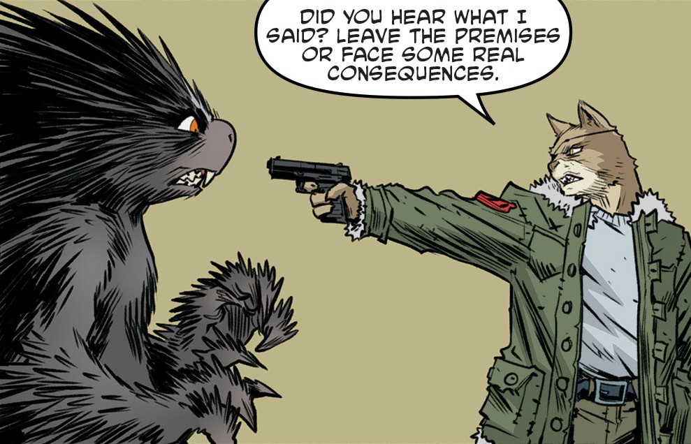 Dans un entrepôt, Diamond suppliait Old Hob de la garder au sein des Mutanimals, et ne pas prendre en compte la demande de Pride. Le chat avait confiance en son commandant et savait que le porc-épique était trop instable. Il respectait cette décision, malgré les menaces de l’ancienne recrue. Il pointa son pistolet vers elle avant de lui tourner le dos et s’en aller. Si ce travail était tout ce qu’elle avait pour survivre dans la ville, elle n’était pas prête à s’en aller sans une petite vengeance.