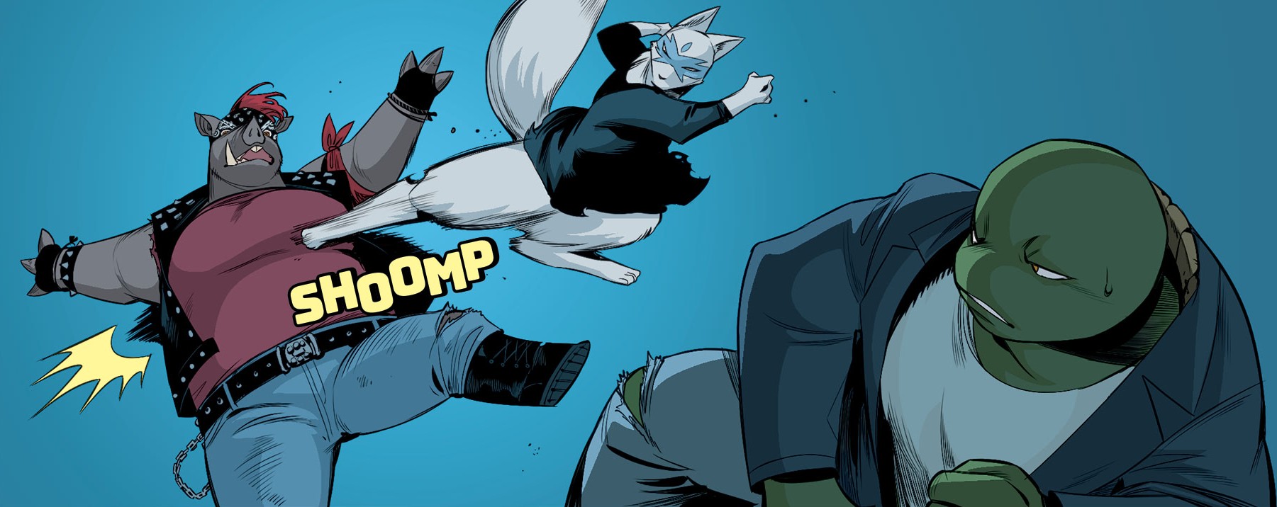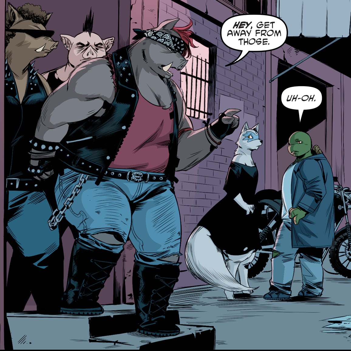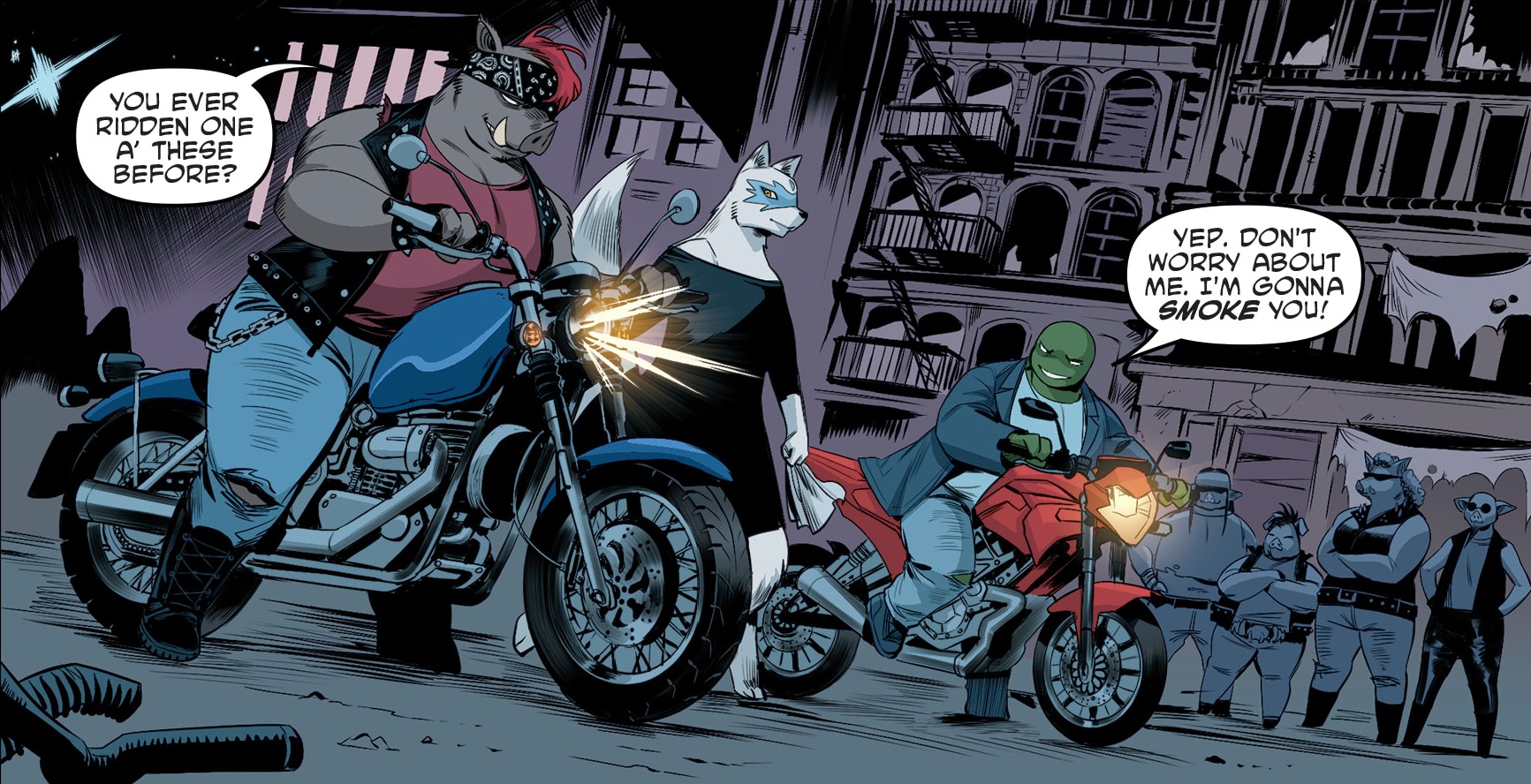 Dans les rues de Mutant Town, Raphael et Alopex profitaient de la vie tels de vrais humains. Ils pouvaient déguster des burritos ! Arrivant dans leur quartier, ils voyaient des motos accostées à un bar. Raphael avait toujours rêvé de rouler à toute vitesse à travers la ville avec un de ces bolides, écailles au vent. Des bikers sortaient du lieu et voyaient les deux mutants proches de leur machines. Tusk, leur cheffe, menaçait immédiatement la tortue. Les Road Hogs ne voulaient pas que le Splinter Clan traîne à proximité d’eux. Un combat s’engageait où Raphael faisait preuve de sa dextérité pour leur faire comprendre que le quartier était à tout le monde. Alopex se mêlait également au combat jusqu’à avoir une idée. Pourquoi régler cela dans la violence, alors qu’ils pourraient tout simplement faire une course de moto ?