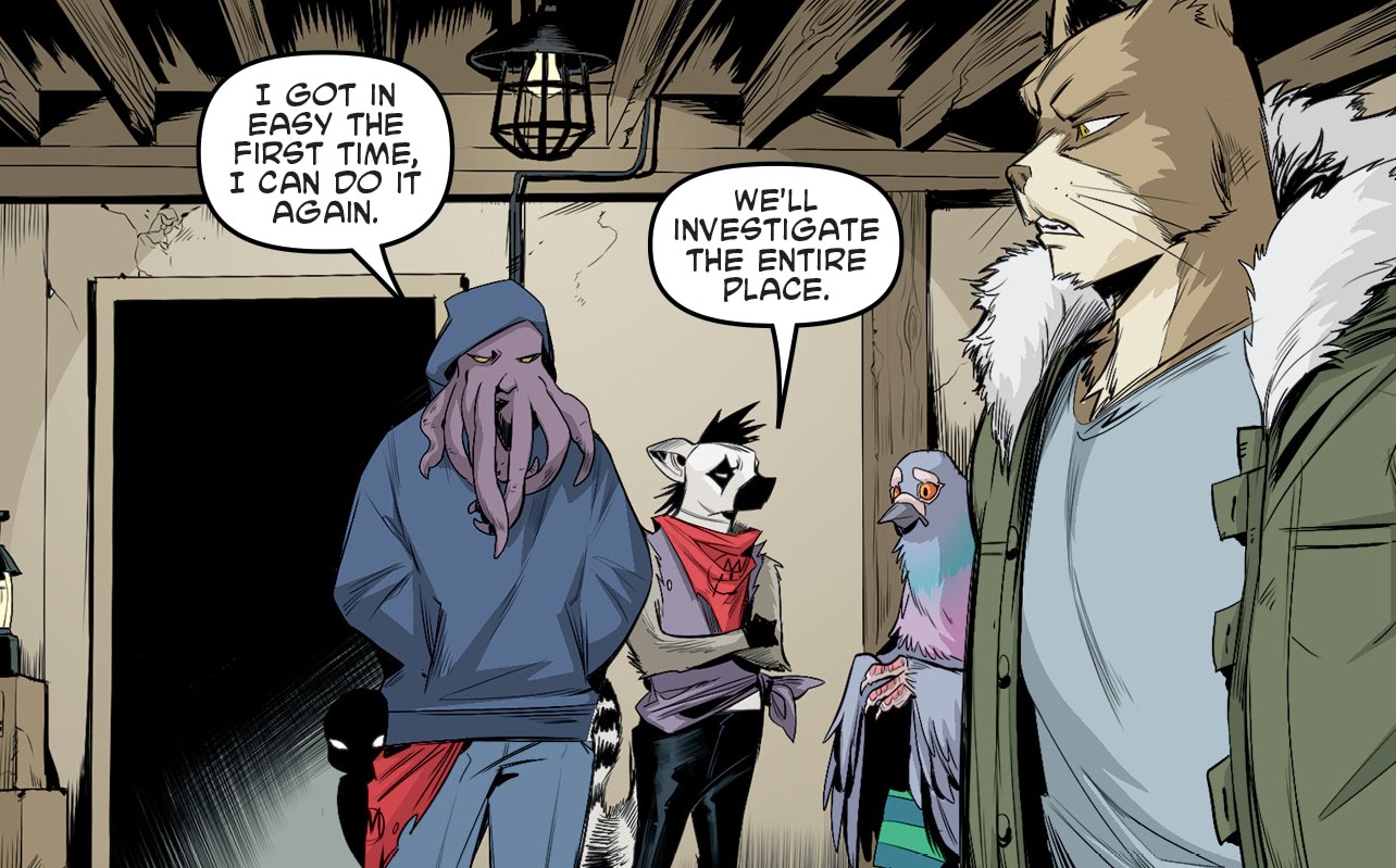 La tortue arrivait bientôt vers une pièce où une voix bien familière demandait comment s’était passée l’infiltration. Stone, le poulpe, racontait son expédition et son combat contre Leonardo à Old Hob. Le chat était préoccupé par l’importance que prenait le Splinter Clan ces derniers temps au sein de Mutant Town. Aucun autre gang n’était aussi influent. Le félin lui demandait d’y retourner, persuadé que le groupe préparait quelque chose. Il pensait que les tortues avaient une base sous le dojo ou quelque chose comme ça. Les Mutanimals y retourneraient le lendemain soir. Mais alors que Leonardo s’apprêtait à partir, il vit Zanna sortir d’une aération dans le mur en direction d’Old Hob, l’appelant « papa ». Mushroom essayait de l’arrêter, en vain.
