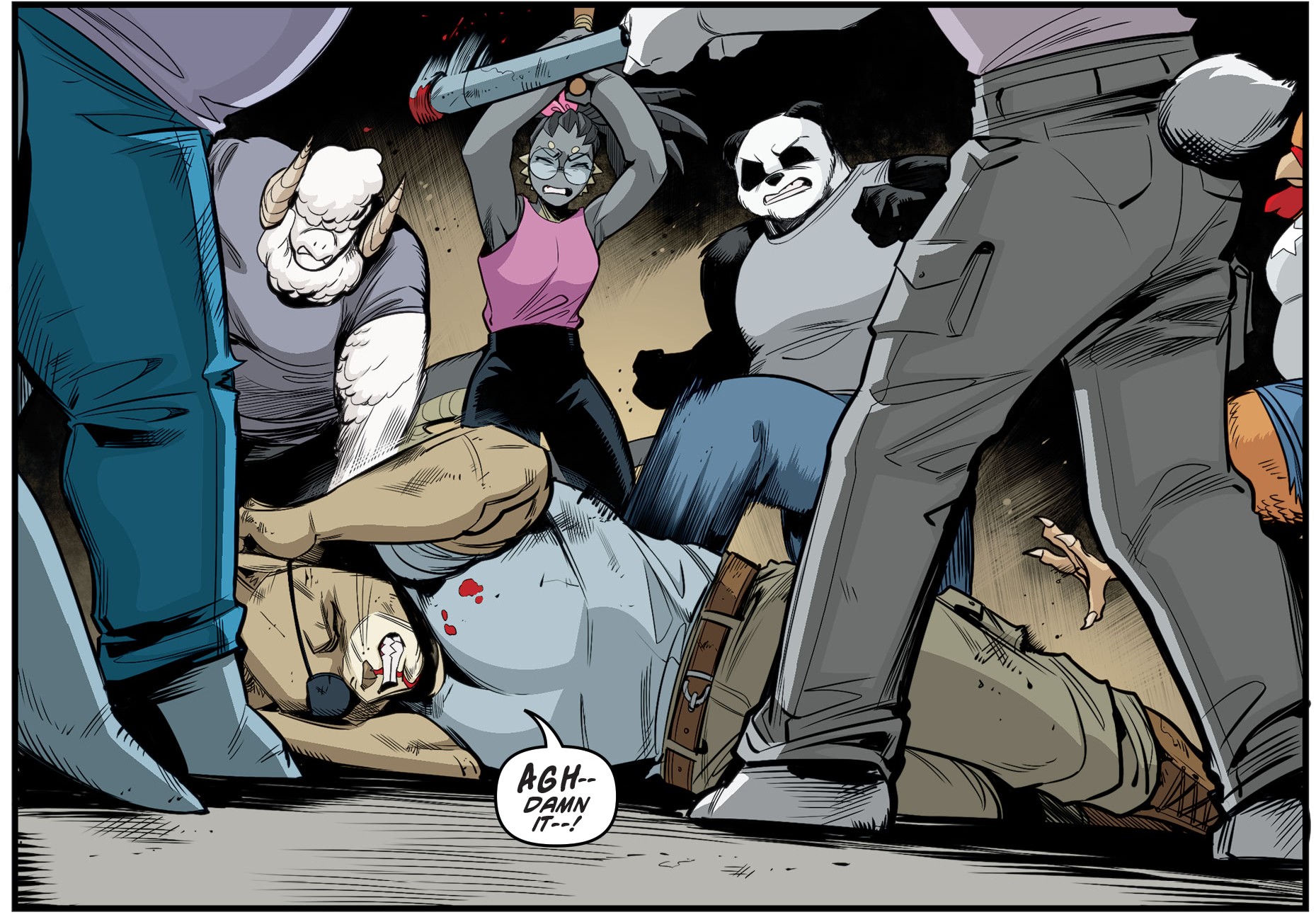 Le chat ne se laissait pas faire, lui assénant un nouveau coup de griffes au visage. Aveuglé par la colère et ces derniers mois éprouvants, la tortue jetait son ennemi contre le mur et lui plantait son saï dans l’épaule droite, à la stupeur des siens. Le combat était à présent terminé. Old Hob ricanait alors que la tortue reprenait ses esprits, secondé par Michelangelo qui l’empêchait d’aller au-delà. Qu’allaient-ils faire de lui dorénavant ? Le chat risquait de s’échapper à nouveau. Les solutions étaient peu nombreuses…