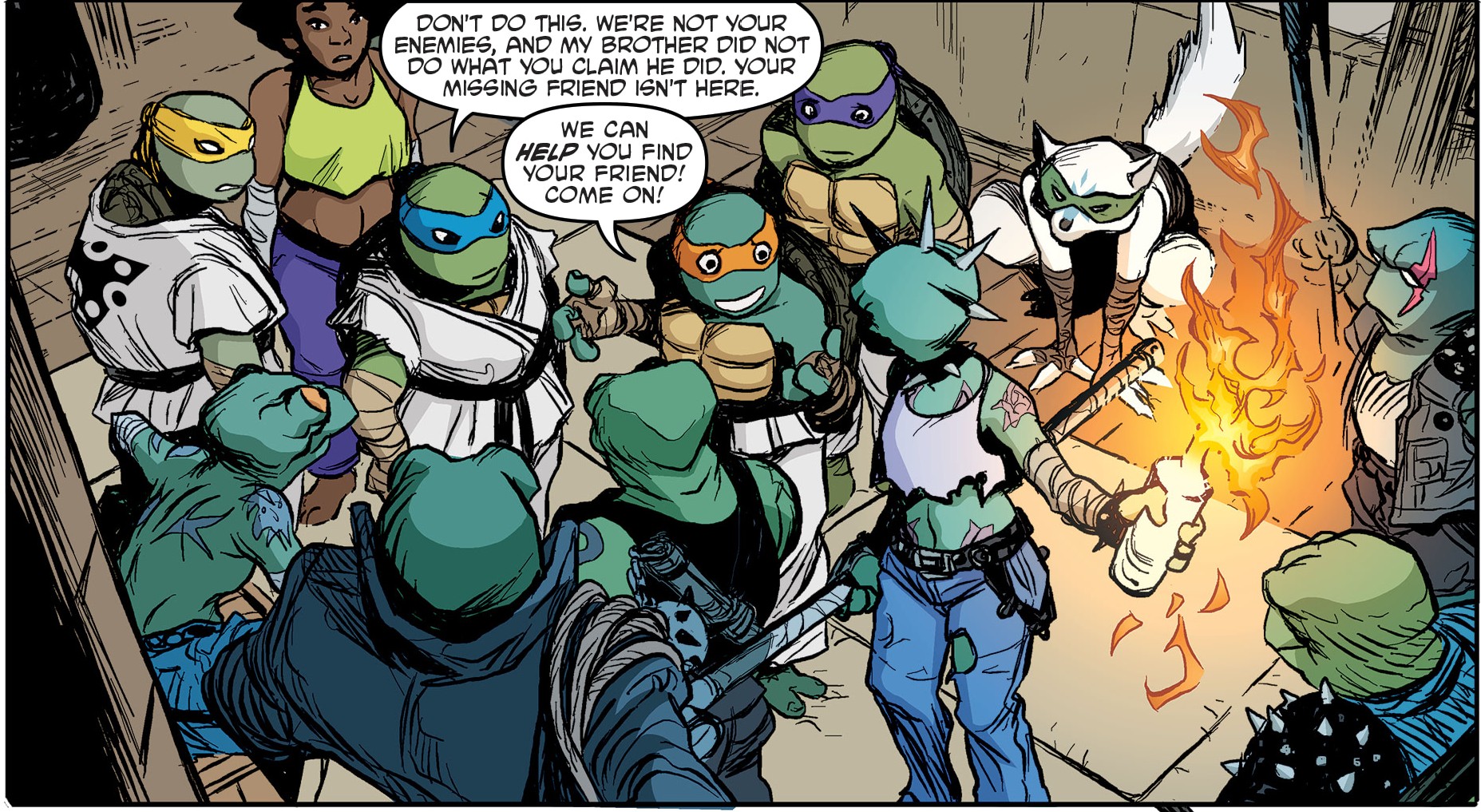 Rien n’y faisait, les punks étaient décidés à se venger. L’une des grenouilles allumait un cocktail Molotov à l’aide d’un briquet. Michelangelo s’emparait de l’arme artisanale avant de se faire désarmer. Le cocktail volait dans les airs. Rattrapé par un des vandales, celui-ci ne perdait pas de temps et le jetait au sol. Bientôt, la pièce était en proie aux flammes, puis tout le dojo. Certaines tortues continuaient le combat tandis que d’autres cherchaient Lita, Klunk, April et Pepperoni. Tous étaient dépités de voir le dojo partir en flammes. Alopex, déçue que Raphael n’ait pas été là, était dépitée. Les grenouilles quant à elles avaient disparues.