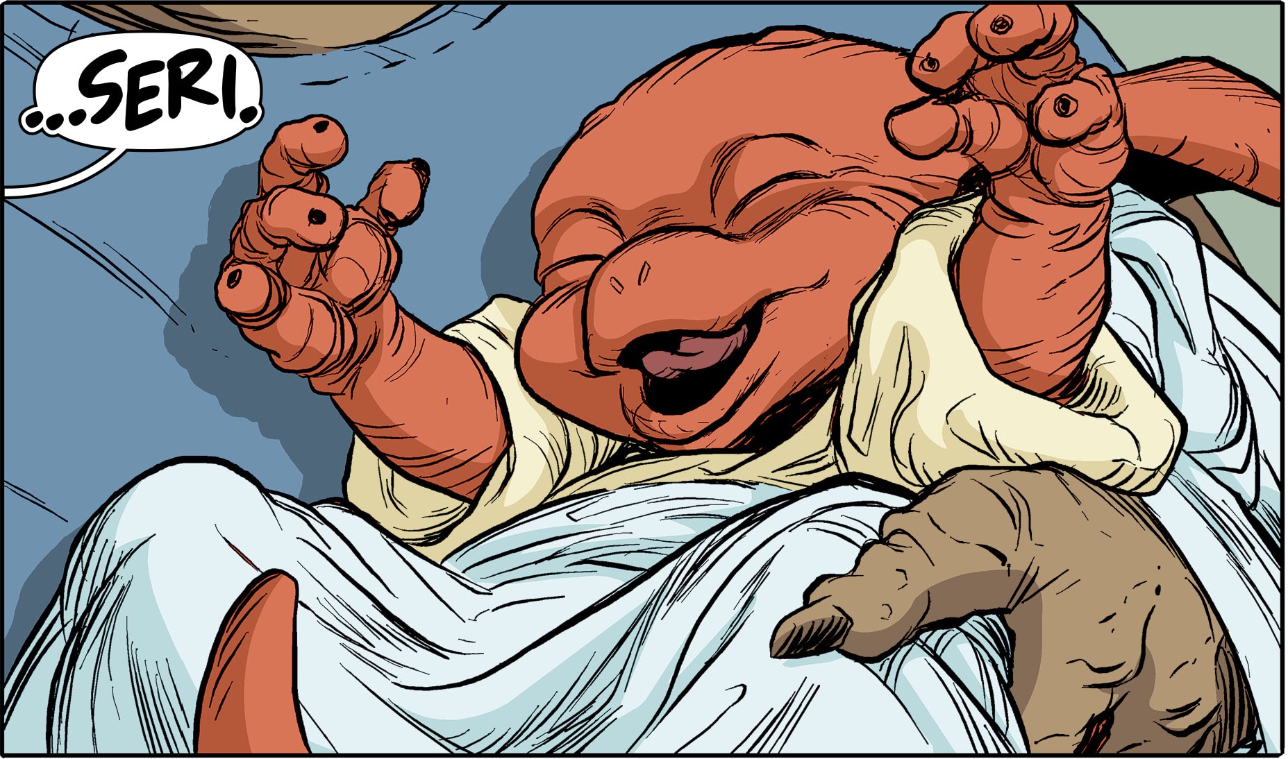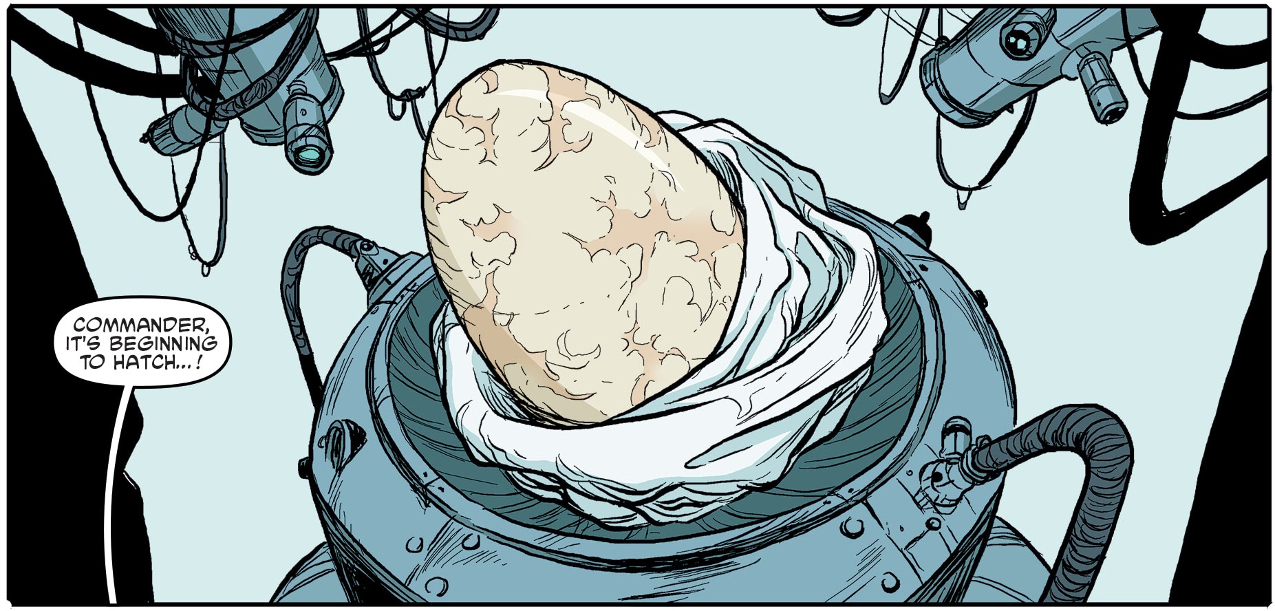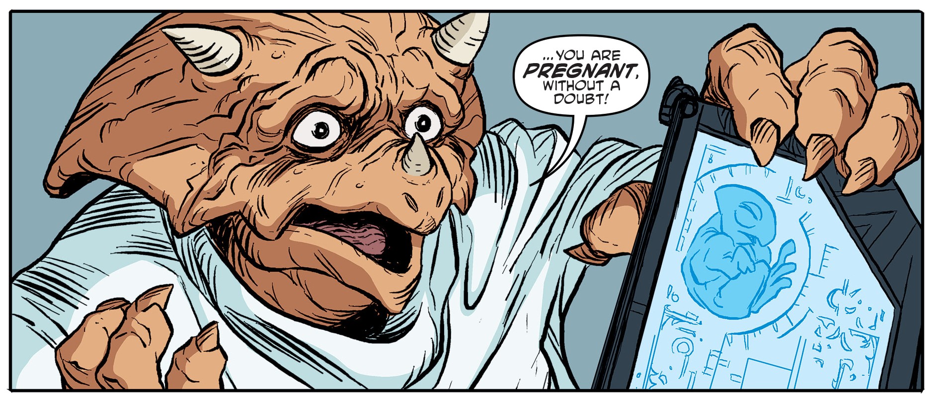 La femelle marginocéphale ne se sentait réellement pas bien. La dispute la fatiguait et des nausées faisaient leur apparition. Ch’Rell ne cessait pas pour autant ses brimades. Le médecin Zura entrait dans la pièce, s’excusant de les interrompre. Seule une nouvelle majeure l’aurait faite transgresser les règles. Et elle était de poids ; Zom attendait un enfant. Le premier depuis Zog (TMNT Universe #17). La commandante ne comprenait plus rien.