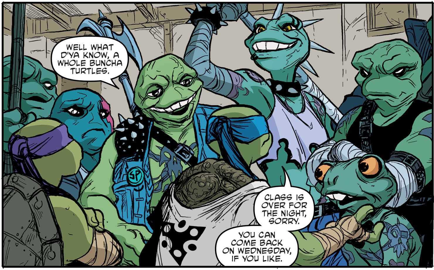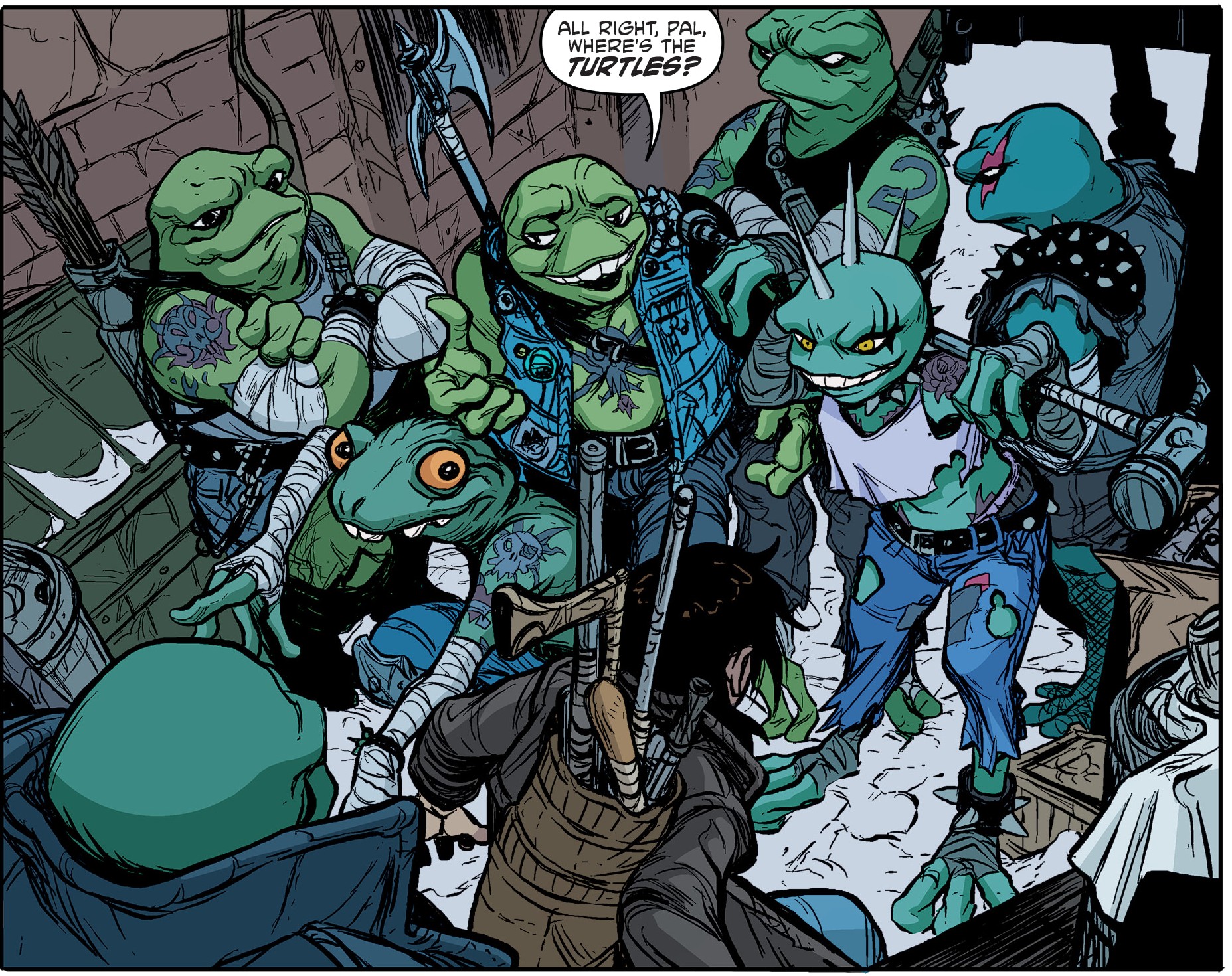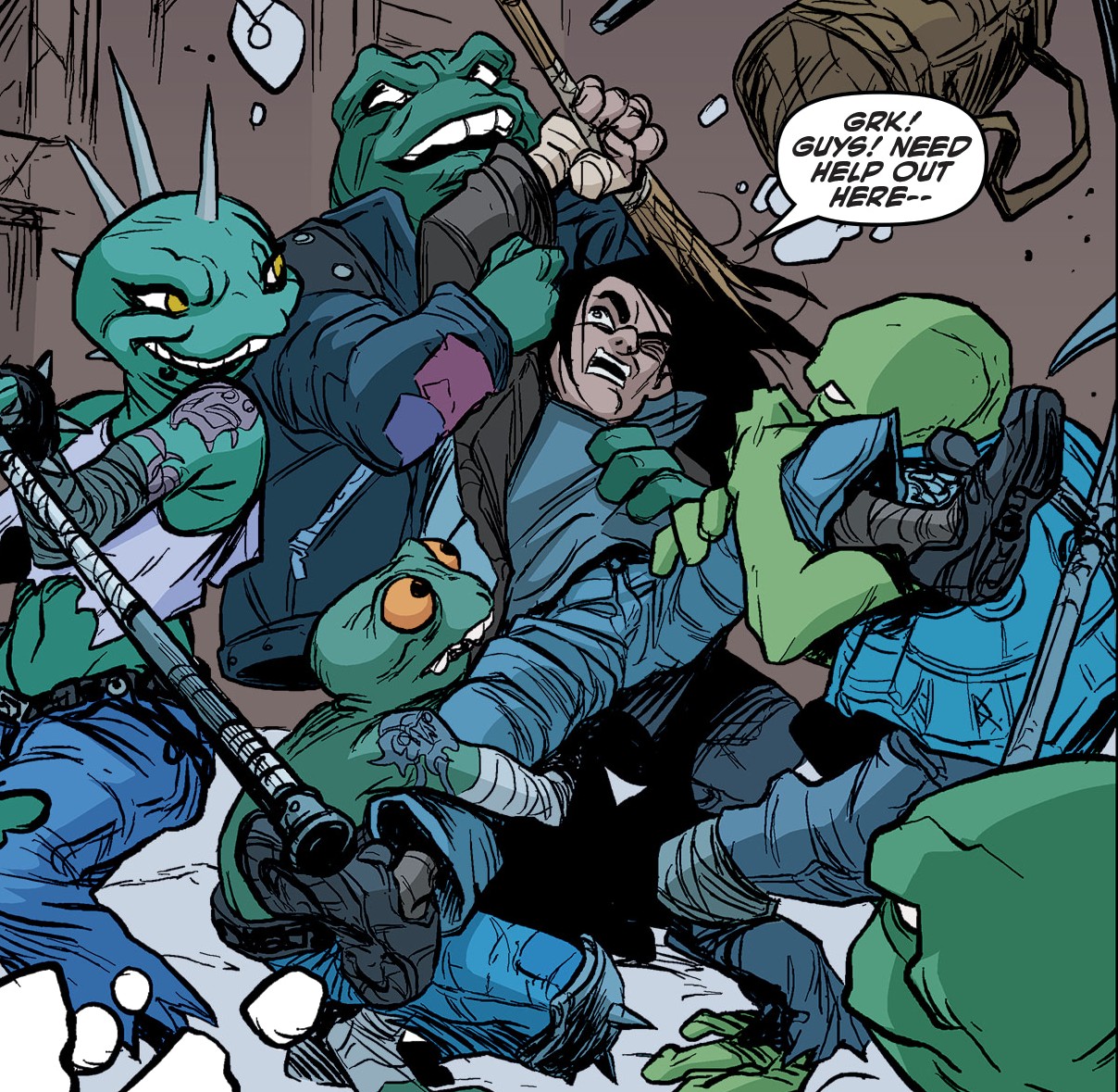 Casey sortait du dojo déçu par une réflexion de Jennika. Il dégainait sa batte et commençait à se défouler sur une poubelle dans la rue. Son arme se brisait en miette. C’en était fini pour elle ! Au même instant, des mutants venaient l’interpeller. Un humain à Mutant Town ? Il s’agissait d’un groupe de grenouille se faisait appeler les Punk Frogs (Grenouilles punkVF). Les batraciens savaient qu’il était un ami des tortues et voulaient leur toucher deux mots. Face à leur provocation, le jeune homme ne disait rien jusqu’à prendre un coup dans l’estomac. Il répliquait sur le champ avec sa batte brisée. En réponse, les six mutants fondaient sur lui. Casey appelait à l’aide ses amis. C’était une erreur à ne pas commettre. Les grenouilles étaient persuadées que le lieu d’où il sortait était bien le dojo. Les tortues ne devaient pas être loin…