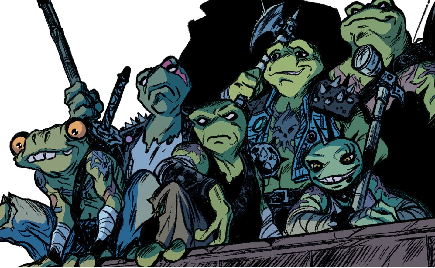 Arrivées sur le territoire des batraciens, il devenait clair qu’aucune discussion n’était possible. Les grenouilles leur sautaient dessus, voyant que les reptiles avaient des armes en main. Elles ne croyaient pas en la discussion prétextée. Un nouveau combat s’engageait. Donatello se faisait prendre la cheville dans le lasso d’un fouet et jeté hors du toit de l’immeuble avec Alopex. Ils atterrissaient dans une maison voisine.
