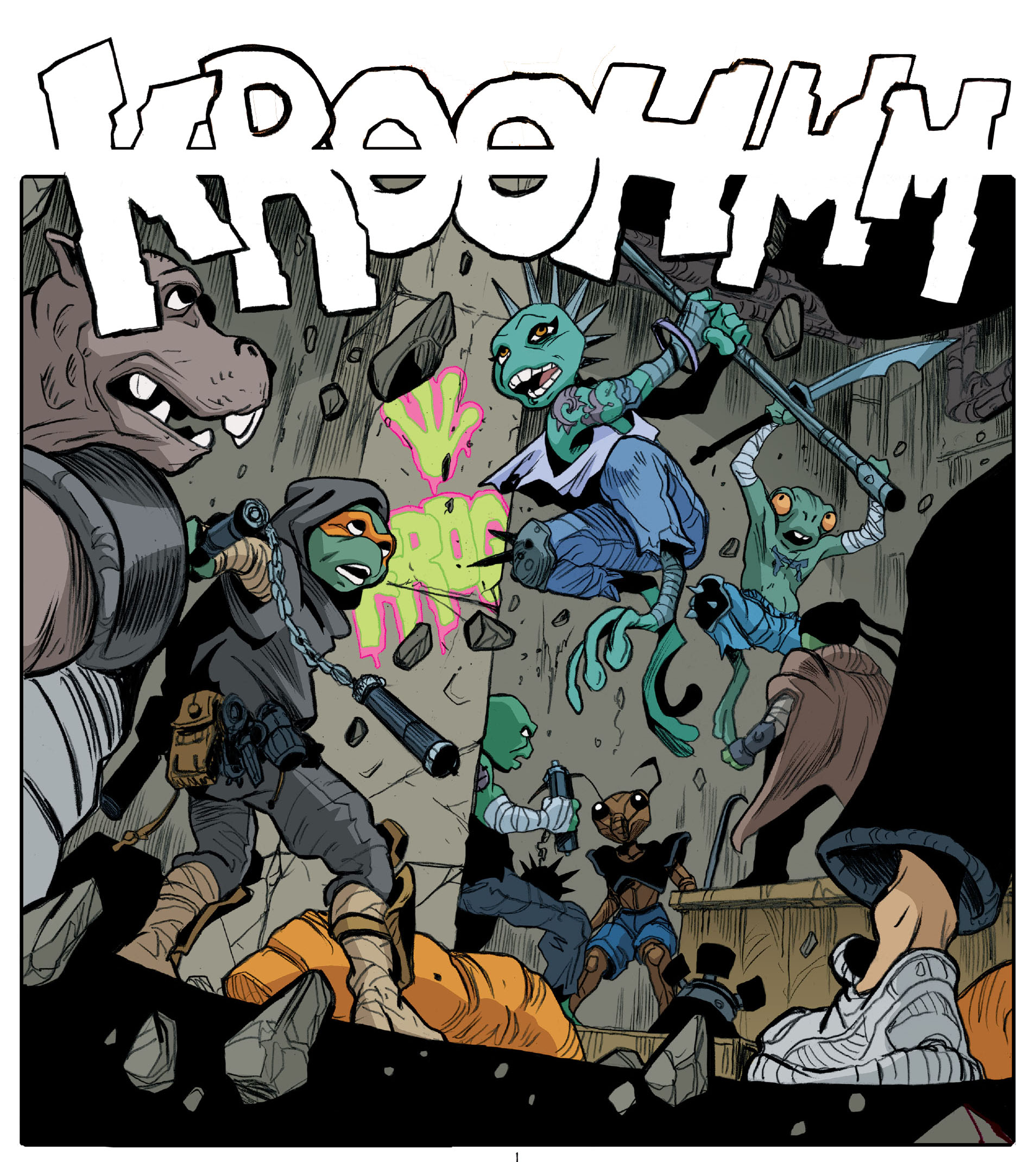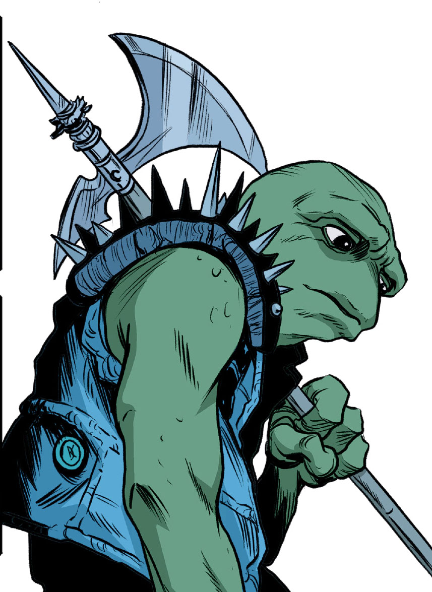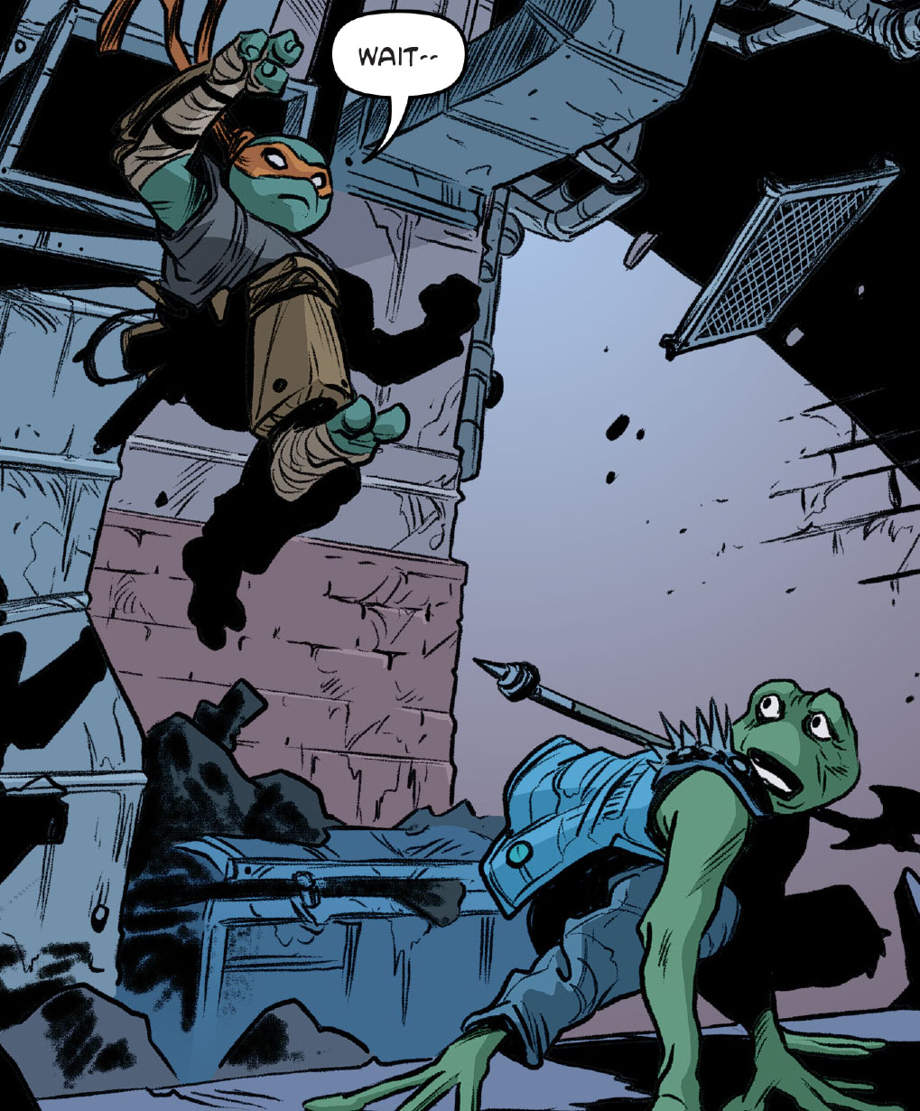 Le bruit fracassant de l’explosion du laboratoire du Dr. Barlow faisait trembler bien des quartiers. Les grenouilles profitaient de cet élément de surprise pour prendre la fuite. Michelangelo se lançait à la poursuite de l’une d’elle par des conduits d’aération. La rattrapant, il cherchait à lui parler comme à son habitude pour la raisonner. Le batracien ne comprenait pas comment le ninja pouvait avoir encore envie de tisser un lien après la destruction de leur dojo (TMNT (Vol. 5) #125). Michelangelo en avait tout simplement assez de ces confrontations inutiles. Alors que son groupe l’appelait, la grenouille se présentait sous le nom de Genghis avant de prendre la fuite. Raphael et Casey rejoignaient leur ami également, qui disait avoir perdu la trace des Punk frogs. Leonardo s’empressait de repartir dans les égouts pour soigner Carmen, grièvement blessée au cours du combat.
