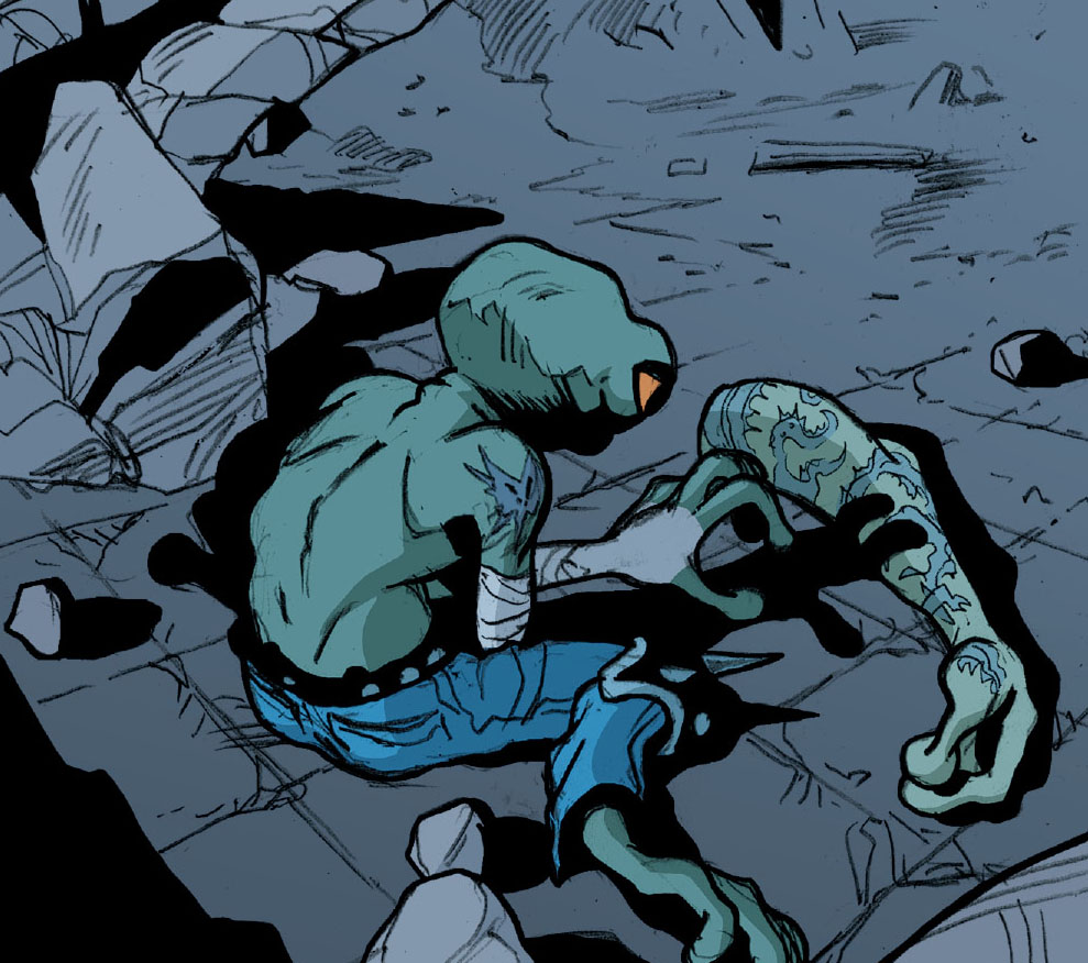 Venus n’était pas loin. Elle observait la scène depuis un recoin sombre des gravats. Donatello avait jeté les bandages que Barlow lui avait donnés avant de rentrer. Ramassant les tissus, elle en faisait une tresse tout en se cachant dans une allée. Une voix venait interrompre sa solitude et les larmes qui perlaient sur ses joues. Il s’agissait de Bludgeon, qui lui tendait la main. Il semblait en savoir beaucoup sur elle. Jouant sur ses particularités propres et la curiosité de l’être hybride, le requin parvenait à entamer la conversation avec Venus et semblait l’encourager à le rejoindre. Il avait ressenti sa puissance depuis l’autre côté de la ville. Lui aussi bénéficiait d’une puissante aura. Mais rien de comparable à la nouvelle venue…