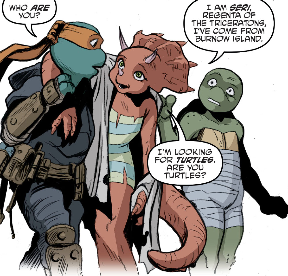 Bientôt, les tortues et Casey rejoignaient leurs amis. Jennika était soulagée de retrouver Sheena, terriblement traumatisée par ce qu’elle venait de traverser. Ce n’étaient donc pas les grenouilles qui les avaient enlevés. Ils entendaient bientôt des appels à l’aide dans les décombres. Les cris provenaient d’un vaisseau triceraton. Libérant la jeune Seri, les tortues étaient stupéfaites. Faisant les présentations, ils rentraient dans les égouts avec une nouvelle invitée. Raphael ne voulait pas qu’ils traînent dans les parages. Les bruits allaient certainement alerter l’Earth Protection Force, qui viendrait prendre le vaisseau pour améliorer leurs connaissances dans cette technologie extraterrestre et enquêter sur la destruction du pâté de maisons.