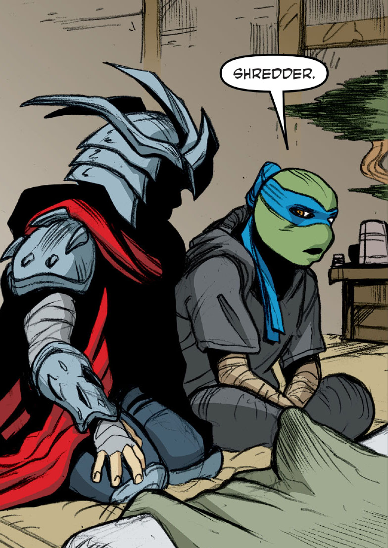 Dans les égouts, Carmen avait été déposée sur un lit de fortune. Leonardo restait à son chevet, regrettant d’avoir amené des élèves du dojo au combat. C’était irresponsable. Les autres disciples semblaient aller plutôt bien, hormis quelques égratignures. April demandait à tous ceux présents dans la pièce de laisser la tortue seule avec la convalescente. C’est alors que Shredder apparut à ses côtés. Il refusait de répondre à ce surnom, malgré l’armure qu’il arborait. Leonardo ne semblait pas surpris de le voir. L’homme déposait son casque au sol et lui disait qu’ils avaient des choses à faire. Il fallait rassembler la fratrie.