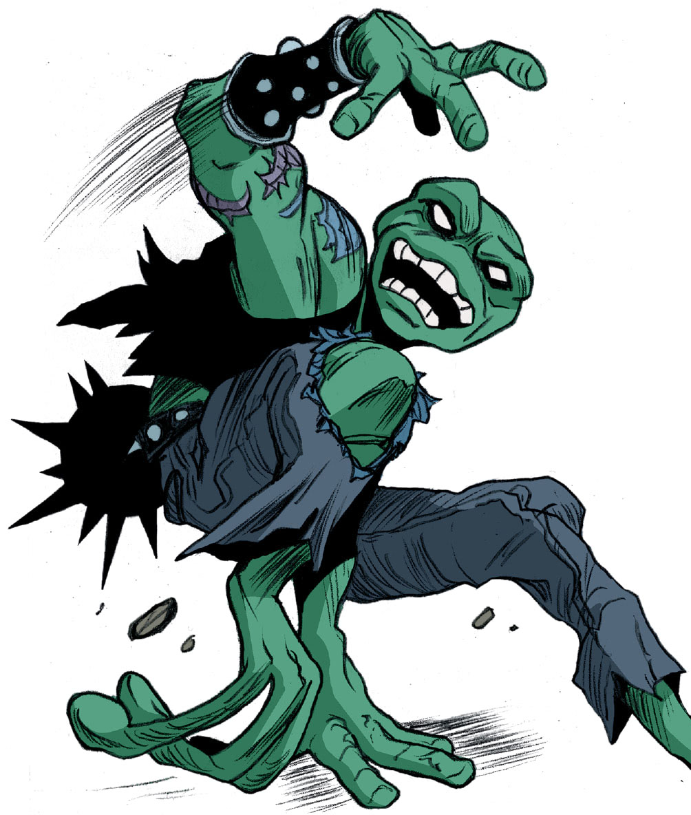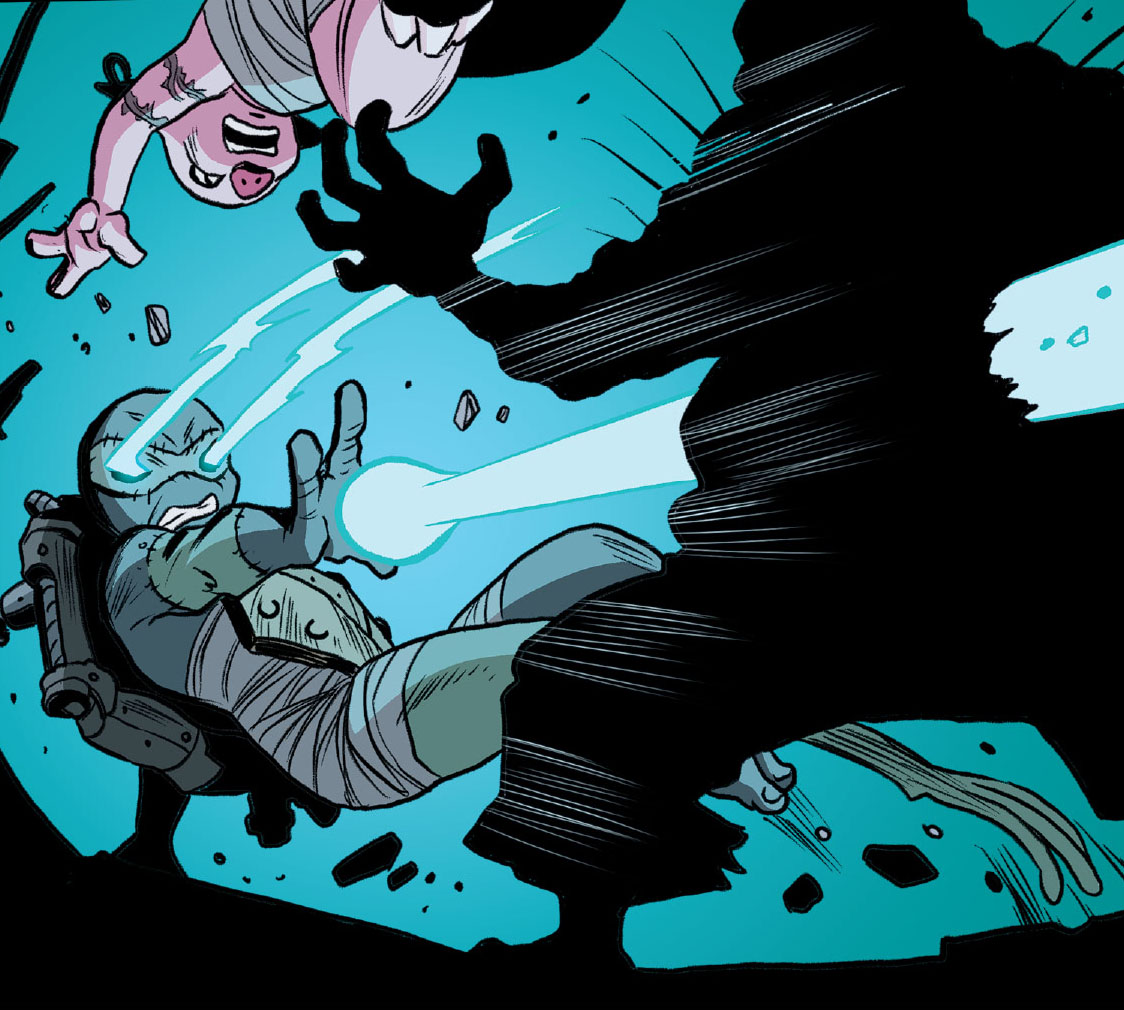 Non loin du désastre, Clyde appelait ses amies grenouilles, qu’il avait perdues dans la confusion de la fuite. Il entendait les bruits d’un autre combat. S’approchant, il reconnaissait Bonnie en proie à un immense taureau rouge. C’était bien elle ! Son visage, ses tatouages. Aucun doute ! Sans perdre de temps, la batracien saisissait son sabre et sautait sur la bête cornue pour défendre son amie. Au même moment, Dirtbag s’emparait de Sheena pour la dévorer. Venus s’interposait et d’un geste de la main, produisait un puissant rayon qui traversait le ventre de la taupe. Prise de panique après ce qu’elle venait de vivre, la truie saisissait un rocher au sol et lui fracassait le crâne à plusieurs reprises pour s’assurer qu’elle ne se relèverait plus. Donatello calmait son amie qui venait de commettre un vrai massacre. Il n’avait pas vu Groundchuck dans son dos, sur le point de le massacrer à son tour. Se retournant, il voyait la tête et le bras du taureau voler dans les airs. Clyde venait de le décapiter d’un bond. La soirée de l’horreur touchait à sa fin.