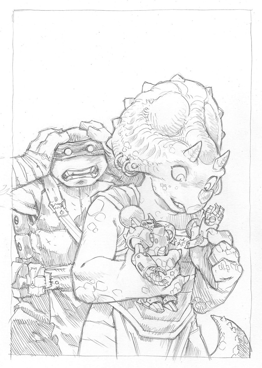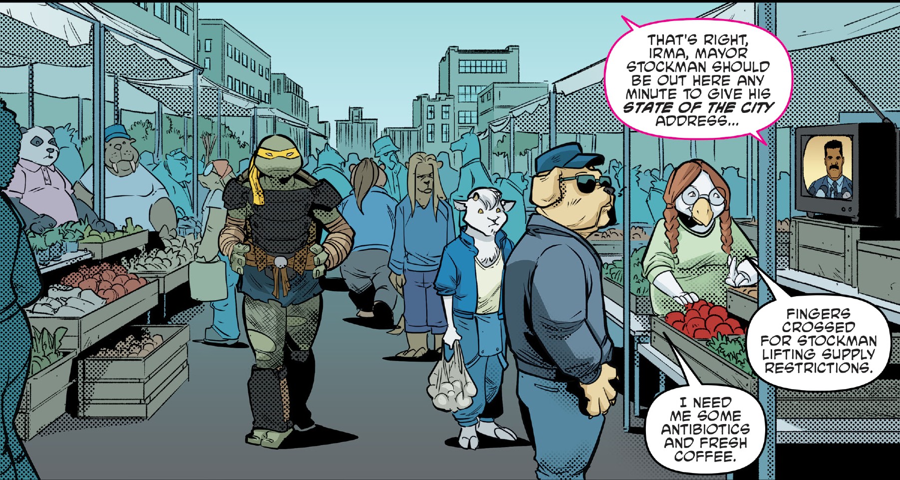 La tortue, arborant son nouvel uniforme, se rendait au marché pour y retrouver Wanda et Lita. Mais à travers les étales, l’ambiance n’était clairement pas des meilleures. Certains espéraient que Stockman lève les restrictions alimentaires visant Mutant Town. D’autres voyaient d’un très mauvais œil les rondes des tortues, comme s’ils étaient surveillés et contraints.