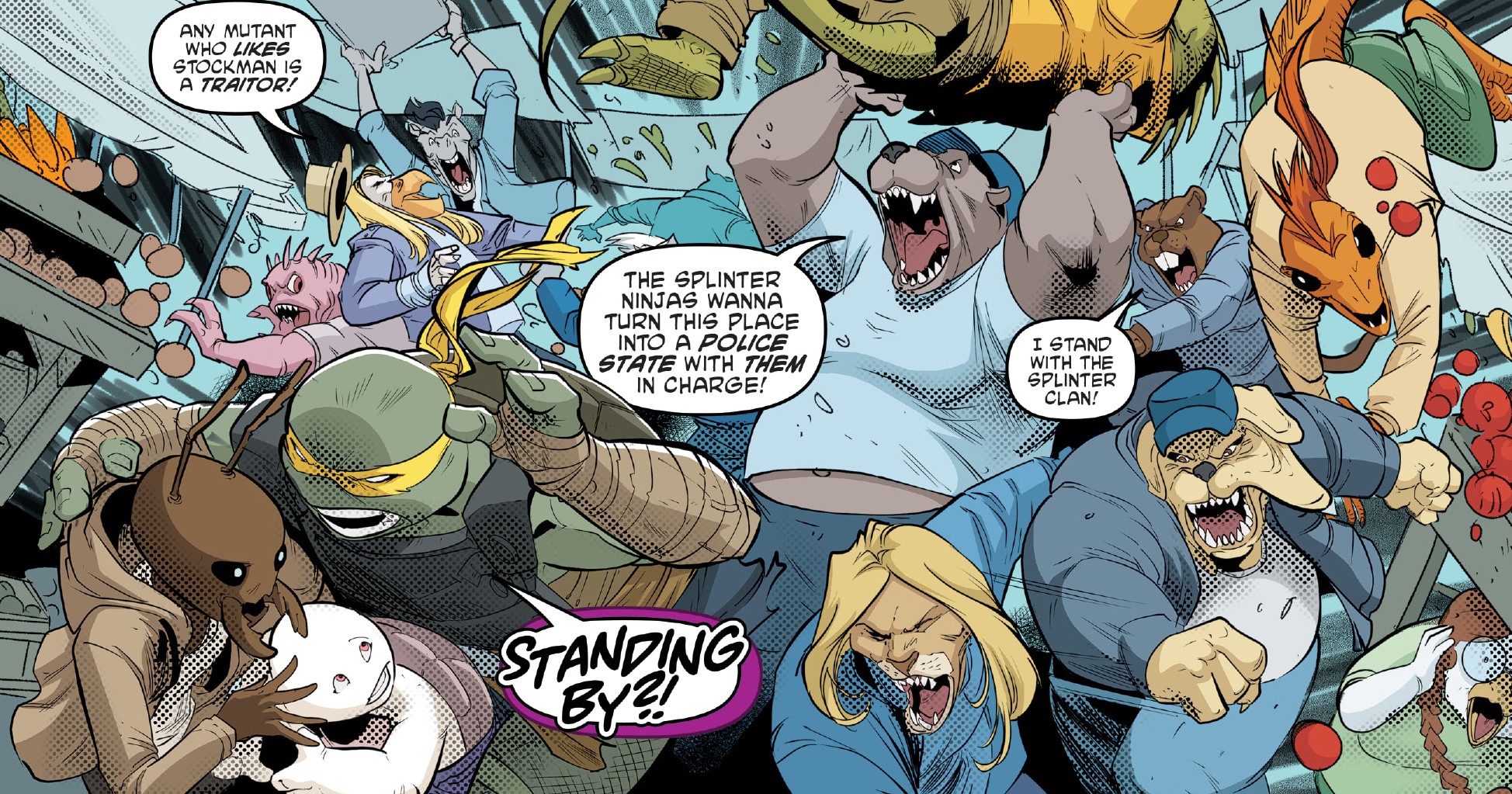 Sur le marché, tous les regards étaient tournés vers l’allocution. Voyant les tortues s’en prendre à Stockman, les habitants de Mutant Town commençaient à s’énerver contre Jennika. Jamais plus l’opinion ne ferait confiance à un mutant. Si ce que disait le maire était déjà grave à leur encontre, cette attaque allait sans doute sceller leur sort. D’autres venaient en défense des tortues. Jennika quant à elle, répliquait qu’elle ne connaissait pas ceux qui s’en prenaient à Stockman. Qu’il s’agissait d’un coup monté. Une bagarre générale éclatait au marché.