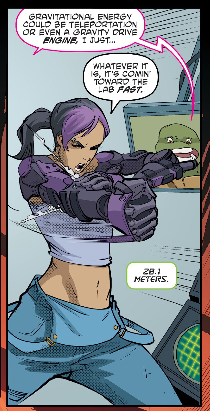 Au même moment entrait Carmen. La tortue, une fois encore interrompue, expliquait à son amie humaine qui était Seri et où se trouvaient ses frères et pour quelle raison. Seri continuait de toucher à tout, très curieuse, jusqu’à mettre les pattes sur le cristal donné par Saki (TMNT #132). Donatello se jetait dessus, craignant le pire. Il ne savait pas encore comment fonctionnait l’étrange minéral et quels étaient ses effets. Ce n’était pas de la magie, mais une science qui n’avait pas encore trouvé d’explications. Il voulait simplement être tranquille pour continuer de travailler sans se faire interrompre à chaque instant.