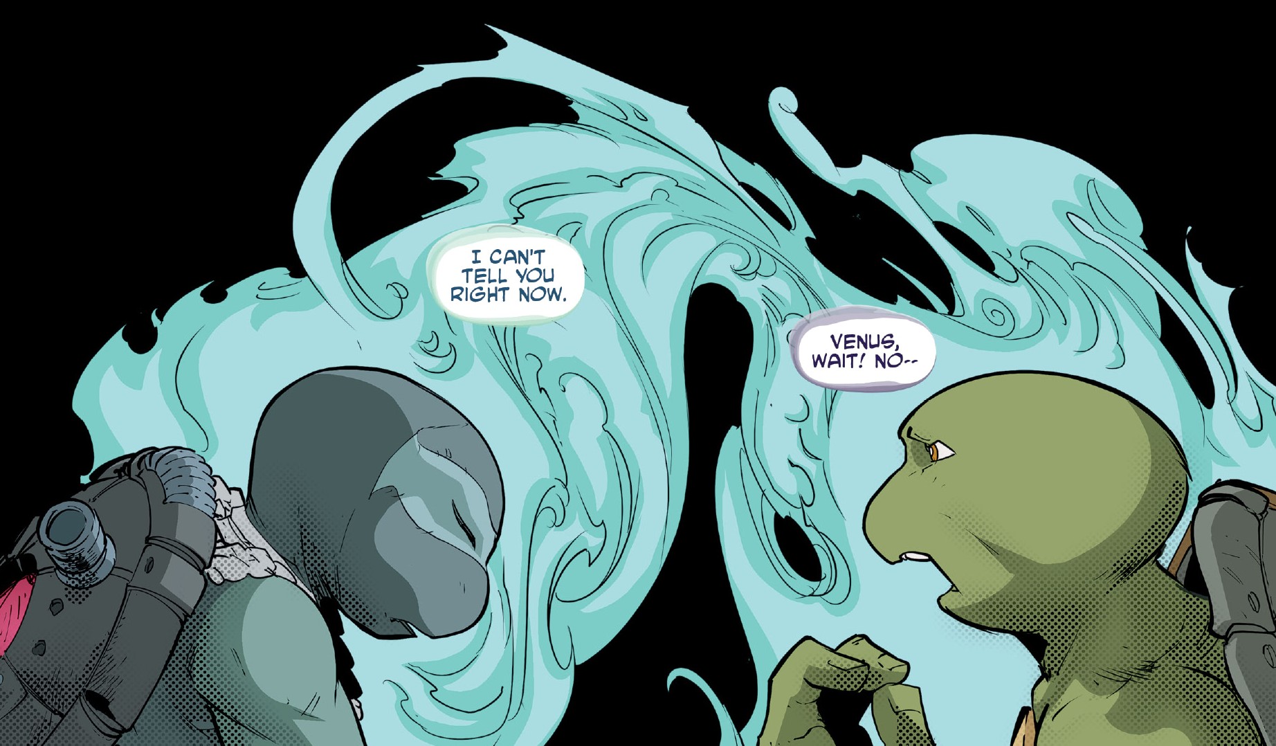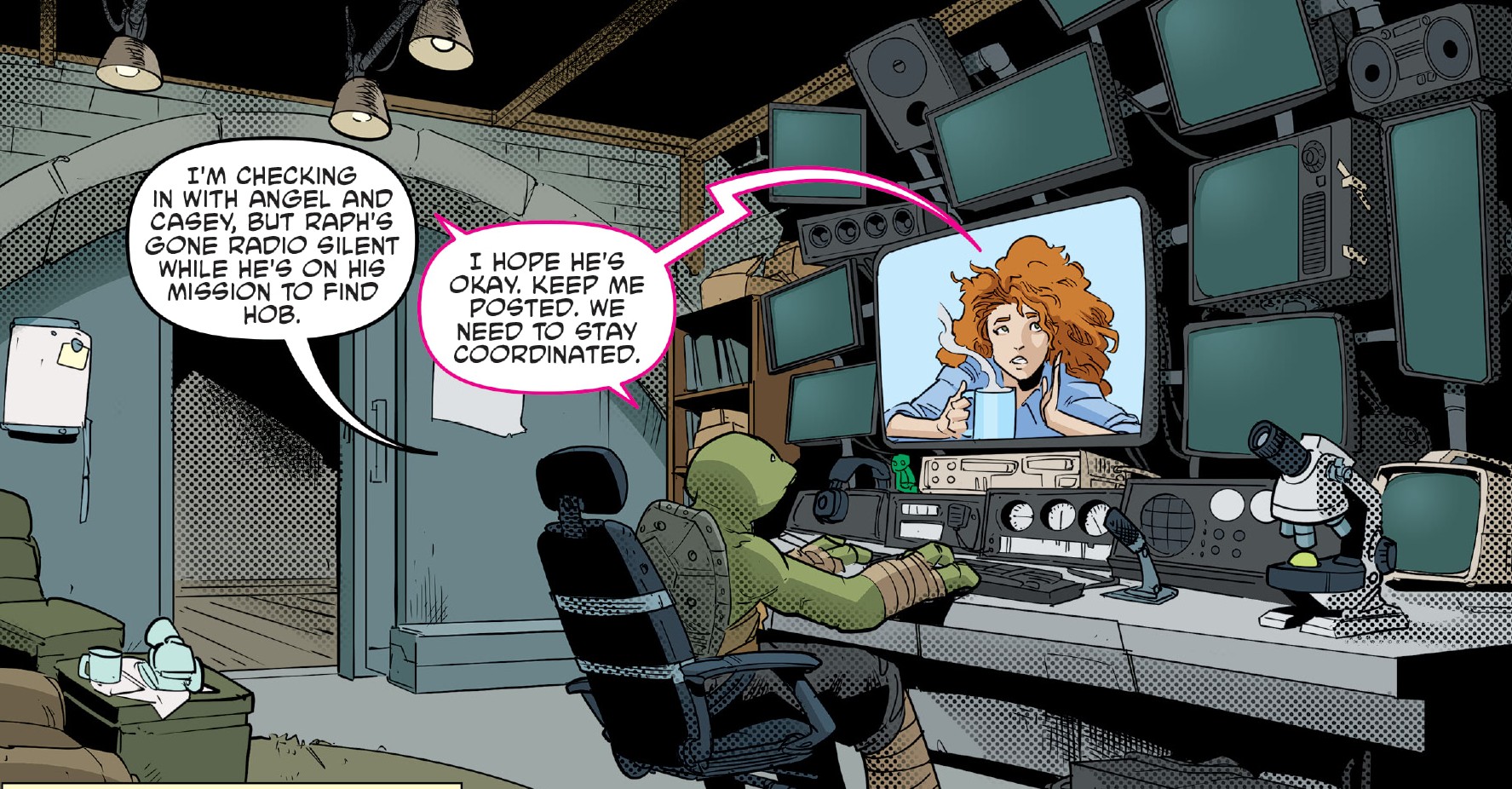 Donatello discutait de la suite de leur plan avec April. Ils n’avaient aucune nouvelle de Raphael, parti à la recherche d’Old Hob (The Armageddon Game #1). Il était interrompu par Seri, qui l’avertissait de la présence d’une femme dans le repaire. Elle n’aurait jamais dû entrer dans les appartements de Carmen. Ni même dans cette pièce ! Elle faisait la connaissance d’April depuis les écrans installés par Donatello, qui semblait vraiment contrarié. Reprenant la suite de leur plan avec April, la jeune femme lui annonçait qu’elle s’en allait retrouver Mona Lisa dans leurs bureaux. Pendant ce temps, Lola partait sur le terrain pour assister à une allocution de Stockman.