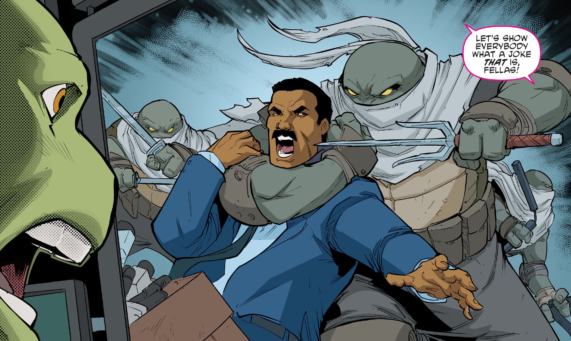 • En dernière page, les noms des rues sur le panneau sont en honneur des deux nouveaux éditeurs du comic, Charles Beacham (Beacham Avenue) et Jonathan Manning (Manning Street). La dernière, Whitman Lane, est un clin d’œil à Jeff Whitman, chargé d’assurer le dialogue entre Viacom Global Publishing et IDW Publishing. Il est très présent sur les réseaux sociaux lorsqu’il est question de valoriser la licence Tortues Ninja.