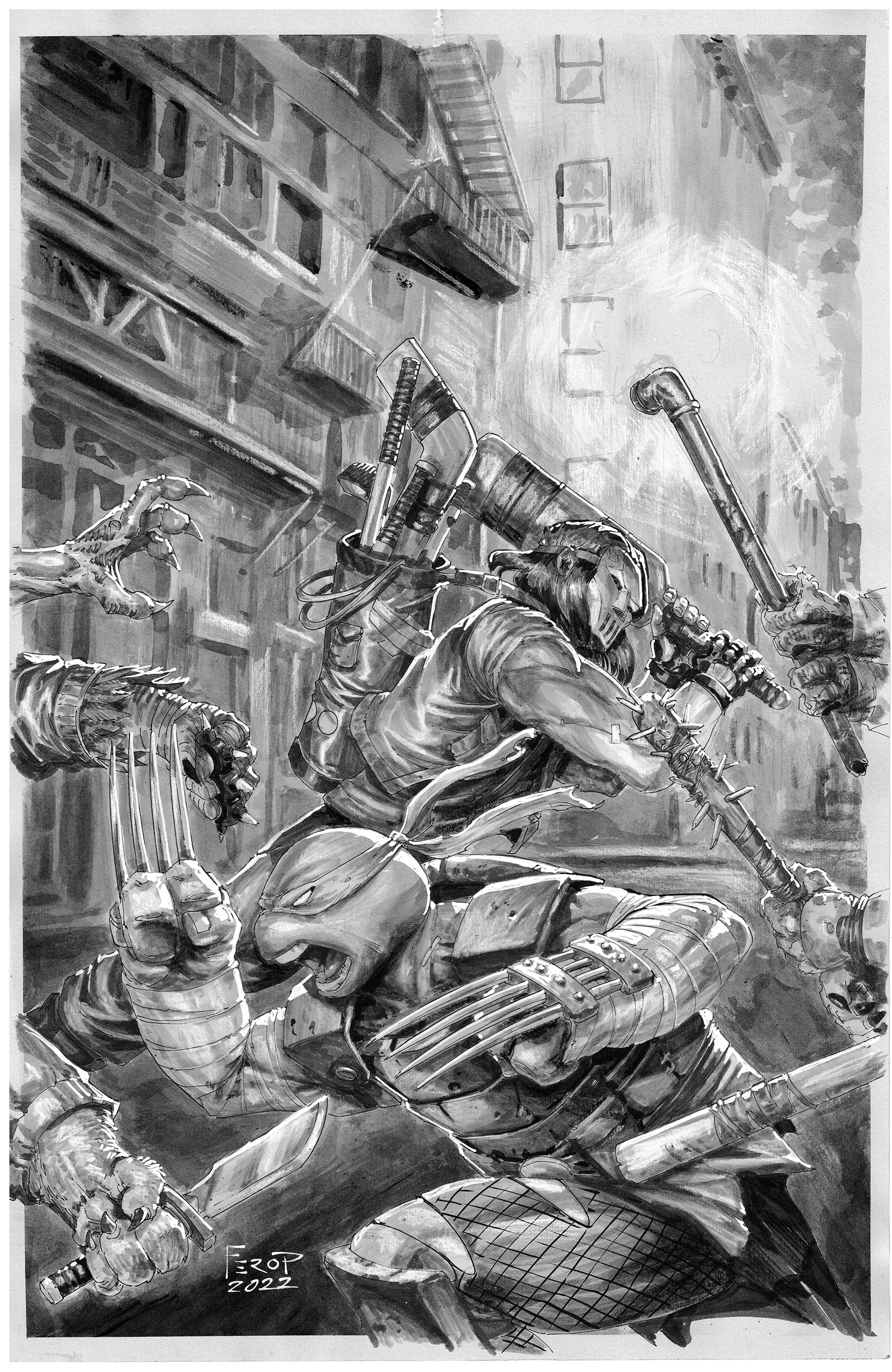 Mais les compagnons n’étaient pas encore tirés d’affaire. Donatello se souvenait de ce que lui avait dit Angel. Au moins cinq créatures l’avaient agressée (TMNT #133). En entrant dans le repaire, Jennika avait oublié de fermer derrière elle. Les utroms les avaient retrouvés. Les tortues mutantes fondaient sur leurs assaillants pour les repousser. Le bricoleur en profitait pour avertir son amie que les robots pouvaient tirer des rayons lasers de leur gueule. Les robots étaient coriaces, faits de technologie utrom. Pendant ce temps, Carmen, Seri et les autres partaient se barricader dans les souterrains du repaire.