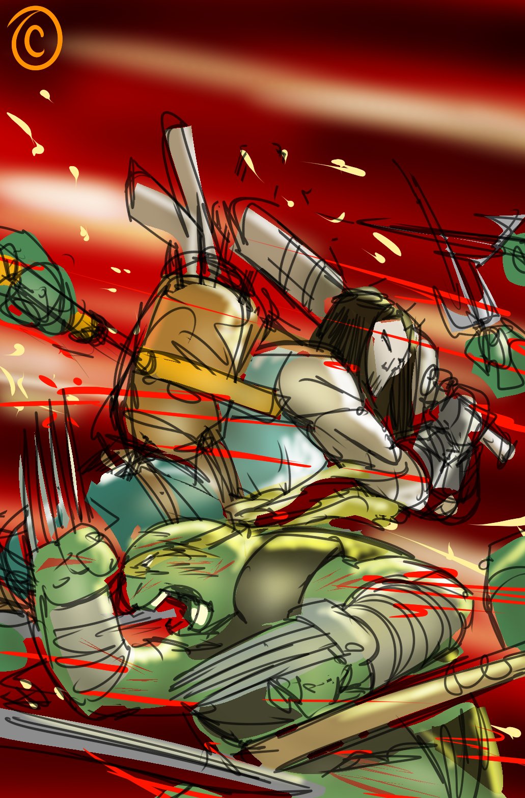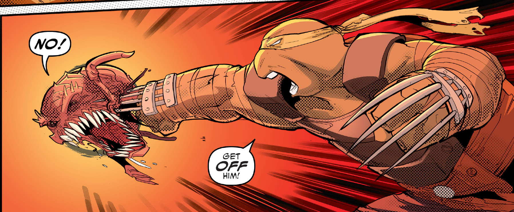 L’utrom jaillissait de la carcasse métallique qui lui servait de corps et se dirigeait vers la tête de Donatello. La tortue, tombant à la renverse, ne parvenait pas à se débarrasser du parasite, qui cherchait à entrer par sa bouche. Carmen et Seri ne parvenaient pas à le décrocher de leur ami. Soudain, la boule rosâtre vola contre le mur avant d’atterrir au sol, laissant une trace de sang. Jennika venait d’intervenir. Pile au bon moment ! L’utrom bougeait encore, Seri l’écrasait de sa patte en poussant l’exclamation patriotique « pour la horde ».