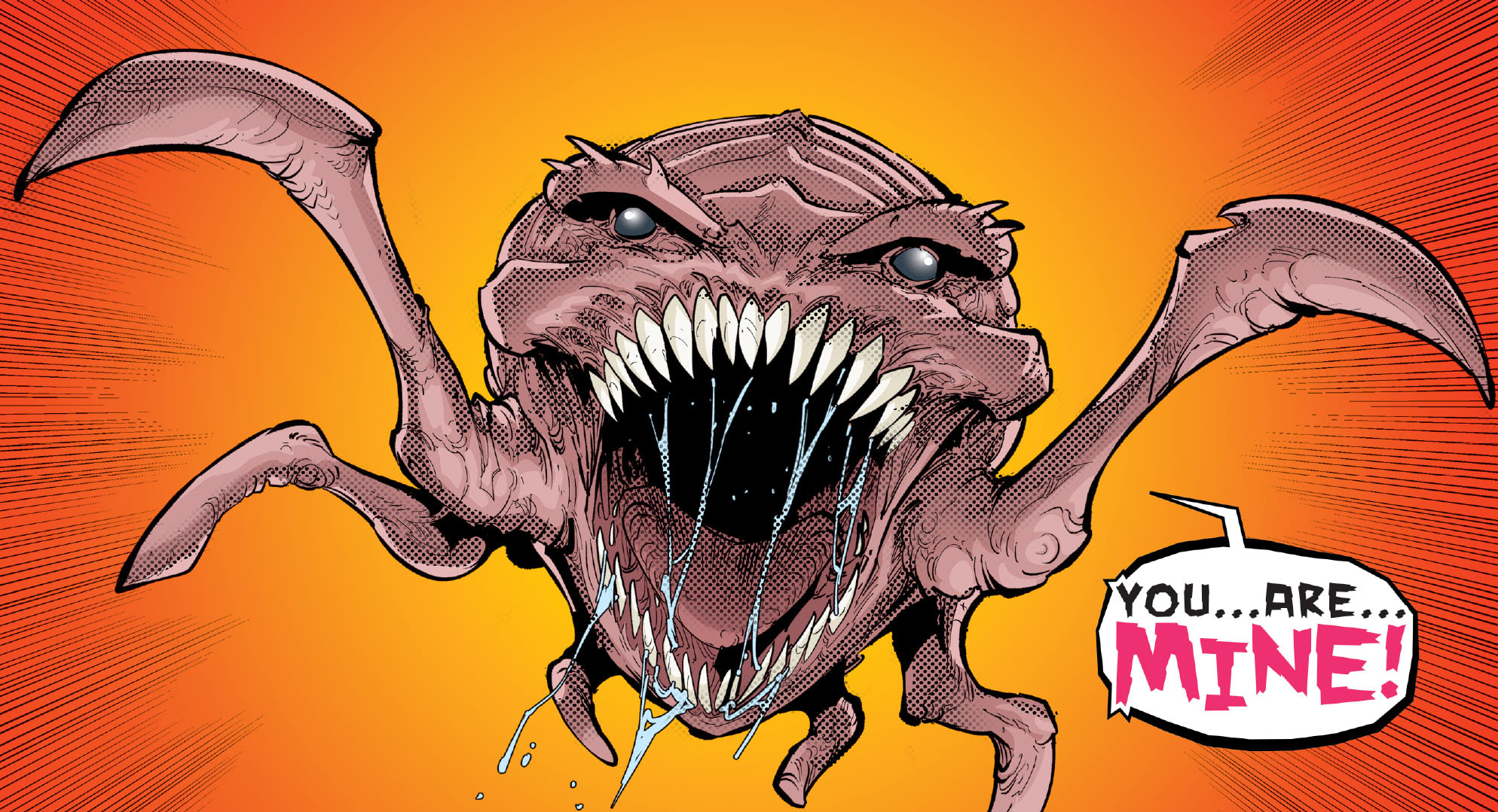 Cette même créature qu’avait rêvée Carmen (TMNT #133). La jeune femme reprit ses esprits, et vit Jennika et Seri, immobiles devant elle. Soudain, le décor se transforma. Elle vit une tortue vêtue dans des tissus et une capuche. Comme dans son rêve. Elle était également figée face à un singe qui activait une télécommande. Soudain, le monstre noir sortit du ciel et la dévora.