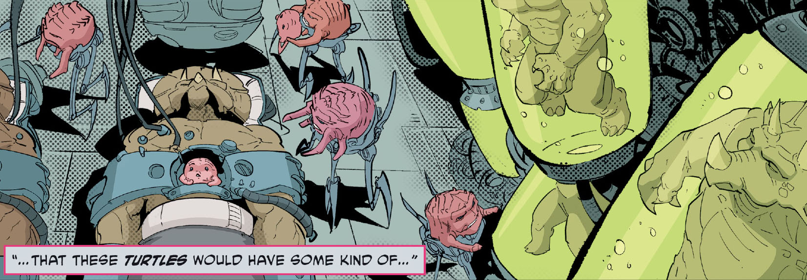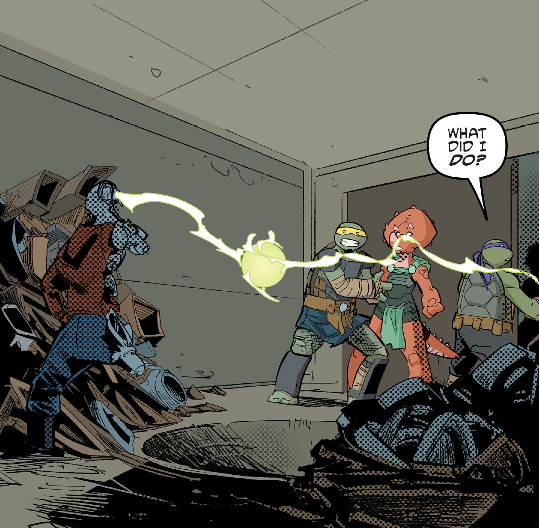 Le combat était peine perdue, les robots utroms repoussaient les deux ninjas jusqu’au sous-sol. Jennika dressait une barricade pour protéger leurs amis et ralentir l’envahisseur. Les tortues ne savaient plus vraiment comment arrêter les extraterrestres.