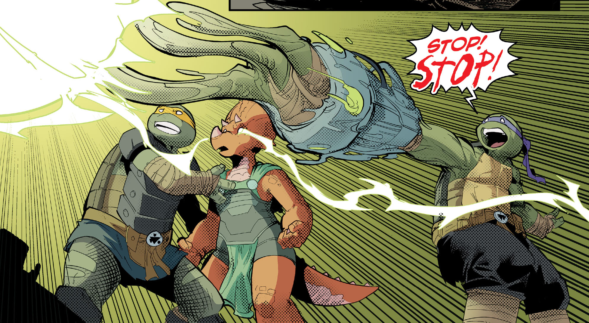 Le gantelet de Donatello ne fonctionnait pas comme il l’espérait malgré l’ajout du cristal magique (TMNT #135). Seri devenait intenable, elle ne demandait qu’à rejoindre la bataille et venger les siens. La situation devenait désespérée. Se concentrant, la tortue sortait de sa cachette. Les utroms tiraient en même temps sur lui. Brandissant le gantelet face à lui, il parvenait finalement à l’actionner. Une onde verdoyante s’opposait à celle des lasers extraterrestres. Une sphère d’énergie faisait disparaître les éléments à son contact. La barricade et le sol étaient rongés. Les squelettes robotiques des utroms aussi. Plus étrange encore, de tous ses amis, Donatello était le seul à encore pouvoir bouger. Les autres semblaient comme figés dans l’espace, une lueur verdoyante sortait de leurs yeux. Au centre du champ de bataille, une boule d’énergie scintillait encore. Soudain, elle grossit et aspira le corps de la tortue et des autres personnes présentes. Traversant un tube temporel, ils se faisaient dévorer par une immense créature noirâtre.