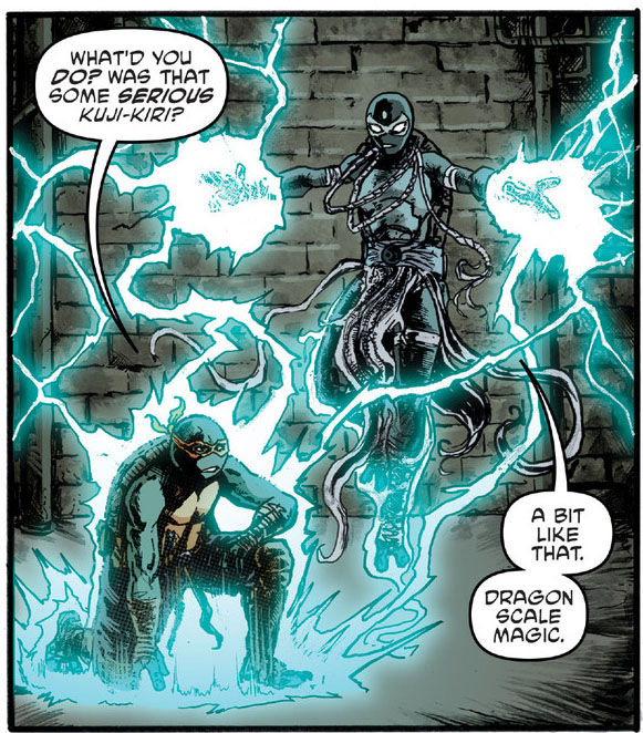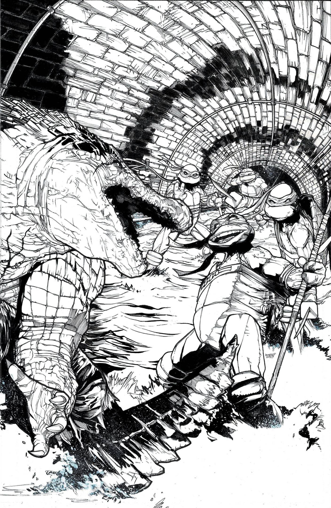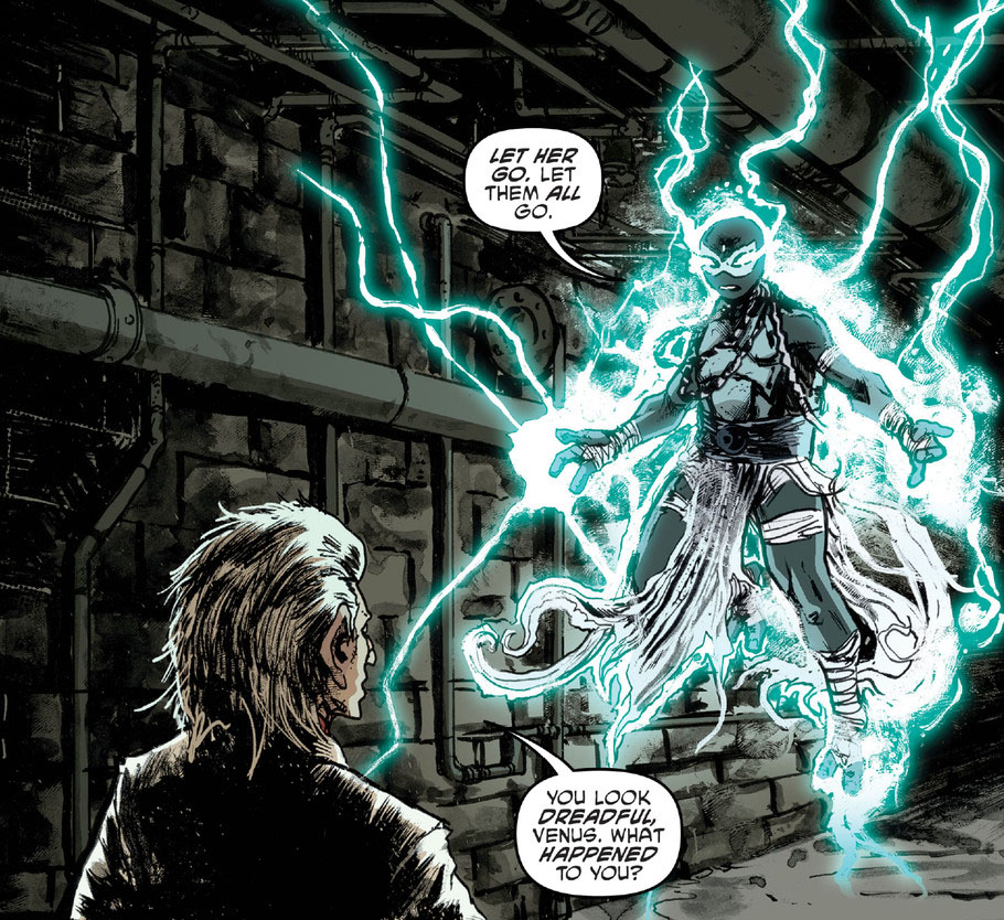 Poursuivant leur chemin, Venus et Michelangelo apercevaient une entrée, obstruée par un rideau. De l’autre côté, une voix se plaignait à Leatherhead. Il s’agissait de Barlow, qui regrettait que l’on ne comprenne pas son génie. Et sa volonté de rendre aux mutants leurs formes originelles. Même si cela devait se faire contre leur propre gré… De l’autre côté du rideau, les deux tortues apercevaient Dirtchuck en train de déposer le corps inanimé de Donatello au milieu d’autres de leurs compagnons inconscientes. Leonardo, Zanna, Zink, ou encore Bludgeon et Koya. Pénétrant dans la pièce, Michelangelo cherchait à ranimer ses amis. Soudain, Venus senti une présence puissance. Il s’agissait de Leatherhead ! Des éclairs rouges sortaient de ses yeux. Dressé sur ses deux pattes postérieures, il laissait entrevoir l’écaille du Dragon sur son abdomen. Le mutant hybride comprenait mieux ses ressentis.