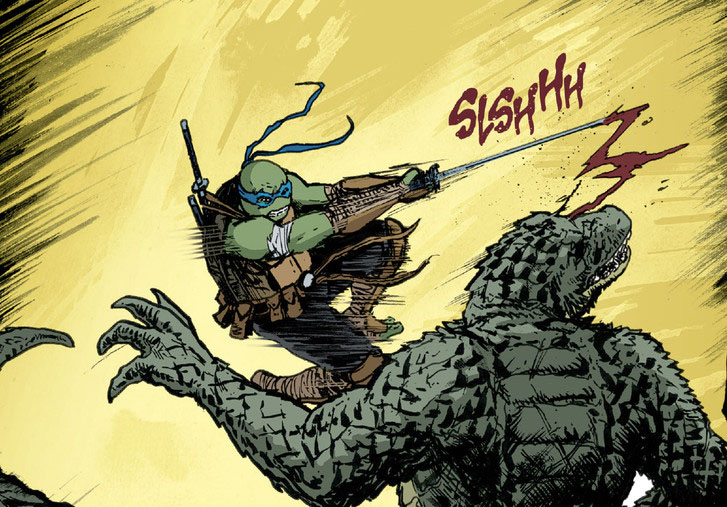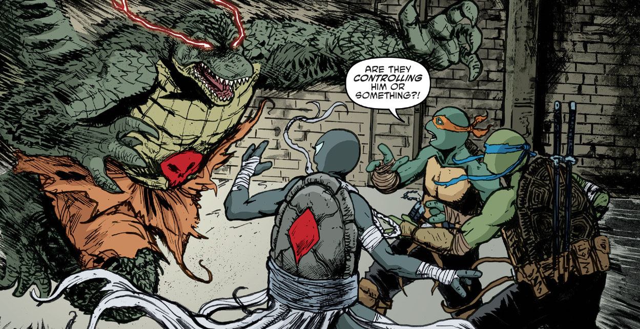Mais contre toute attente, l’alligator ne venait pas les anéantir. Dans un effort colossal, luttant contre l’emprise de l’écaille du Dragon, il demandait de l’aide. Se dirigeant vers Leonardo, il déversa une puissante énergie sur la tortue, venant de cette écaille. La tortue recouvrait immédiatement ses esprits. Derrière elle, Leatherhead prenait sa tête entre ses griffes. Une voix possédait ses esprits et le retournait contre les tortues. Venus avait à peine le temps de créer un bouclier d’énergie, contre lequel l’alligator se fracassait comme une vague contre une digue. Sans perdre de temps, Leonardo fondait sur le reptile et abattait sa lame sur son dos. Le cuir épais du mutant retenait la lame du ninja, qui volait dans les airs. Ni une ni deux, Leatherhead fondait sur Michelangelo, qu’il envoyait valser à son tour contre un mur. Venus, de ses pouvoirs télékynétiques, rendait son sabre à Leonardo. Son arme de retour, la tortue fendait l’air de sa lame, qui terminait sur son visage.