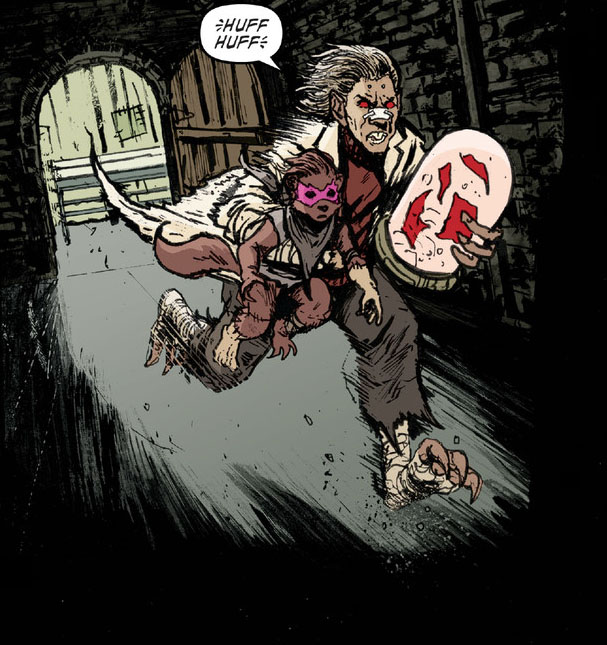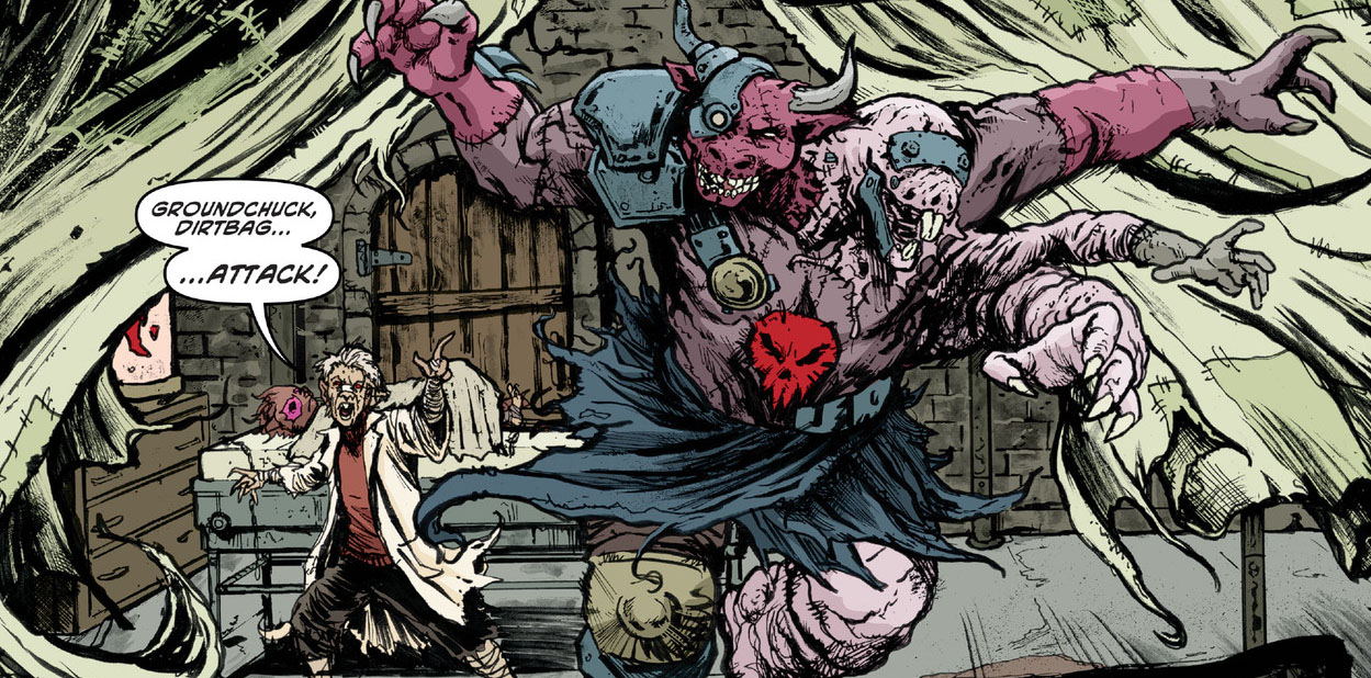 Le docteur Jasper Barlow savourait un verre de vin dans la pénombre. L’opération sur Mushroom était un succès. Derrière lui se tenait Leatherhead, ravi d’entendre la nouvelle. Mais surtout pressé que l’homme s’occupe de lui. Hélas pour l’alligator, Barlow lui révélait ses desseins. Et le saurien n’était autre qu’un pantin – fort utile – dans ses projets. Sa mutation l’avait retiré du monde de la chirurgie. Un monde où il excellait. Il ne supportait pas ce retournement dans sa carrière et dans sa vie. Barlow espérait bien pouvoir changer la tournure des choses et revenir sur le devant de la scène. Entendant ces arguments, Leatherhead commençait à s’énerver et menaçait son acolyte de mort. Mais les deux comparses devraient remettre leurs différends à plus tard. Des intrus approchaient. L’alligator était missionné pour les recevoir comme il se devait.