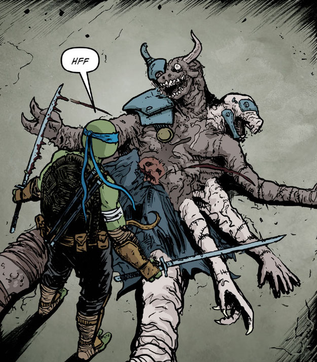 Leonardo menait son équipe dans les égouts. Ils ne savaient absolument pas à quoi s’attendre et formaient des groupes pour plus d’efficacité. Angel et les deux belettes feraient équipe avec lui. Michelangelo seconderait Venus. La tortue en était ravie, jamais elle n’avait pu réellement parler, ni même voir, le mutant hybride. Son naturel chaleureux voulait en apprendre plus à son sujet. Donatello partirait explorer une portion avec Bludgeon et Koya. Cette dernière se montrait très offensive et recommandait à son acolyte de tuer la tortue en représailles pour la perte de sa vue (TMNT #50). Le requin, bien plus sage et posé que son amie lui rappelait que c’était de l’histoire ancienne.