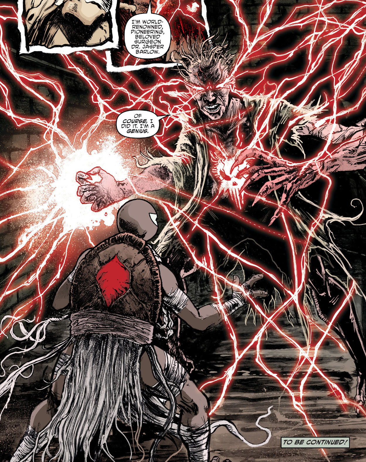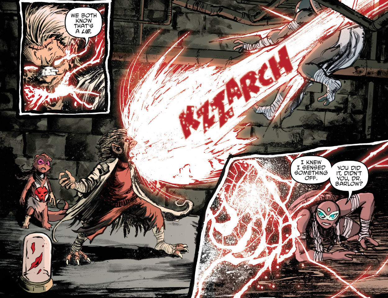 Venus avait poursuivi Barlow à travers les couloirs jusqu’à un cul-de-sac. Face au mur et dégouté de voir sa création si réfractaire à ses expériences, le chirurgien devait révéler toute l’étendue de ses pouvoirs. Il soufflait la tortue d’une puissante onde rouge sortant de sa bouche. Venus était repoussée à plusieurs mètres. Lui aussi s’était greffé une écaille sur l’abdomen. À la différence des autres mutants, il contrôlait son pouvoir…