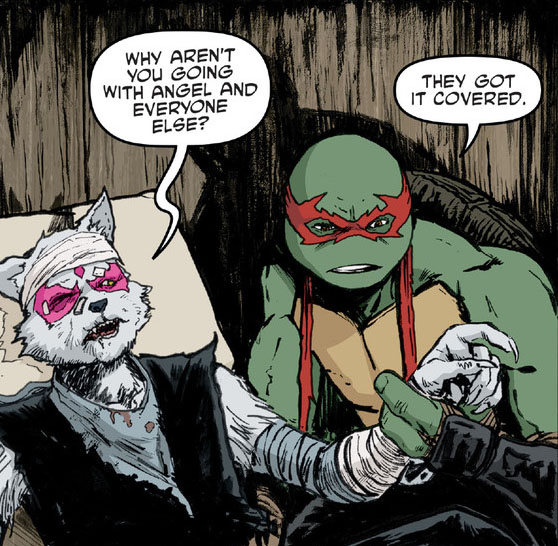 Au même moment, Angel et Jennika entraient. Elles annonçaient aux autres qu’Alopex avait été grièvement blessée par un monstre dans les égouts. Raphael était à son chevet dans sa cachette. La tortue se jetait dans le canapé pour enfin soulager sa jambe salement amochée (TMNT #142). Les tortues se préparaient à intervenir. Carmen et Bob, encore trop peu expérimentés, resteraient également dans le repaire. Michelangelo avait fait d’excellentes recherches et se montrait très avisé. Ses frères ne se privaient pas de le féliciter.
