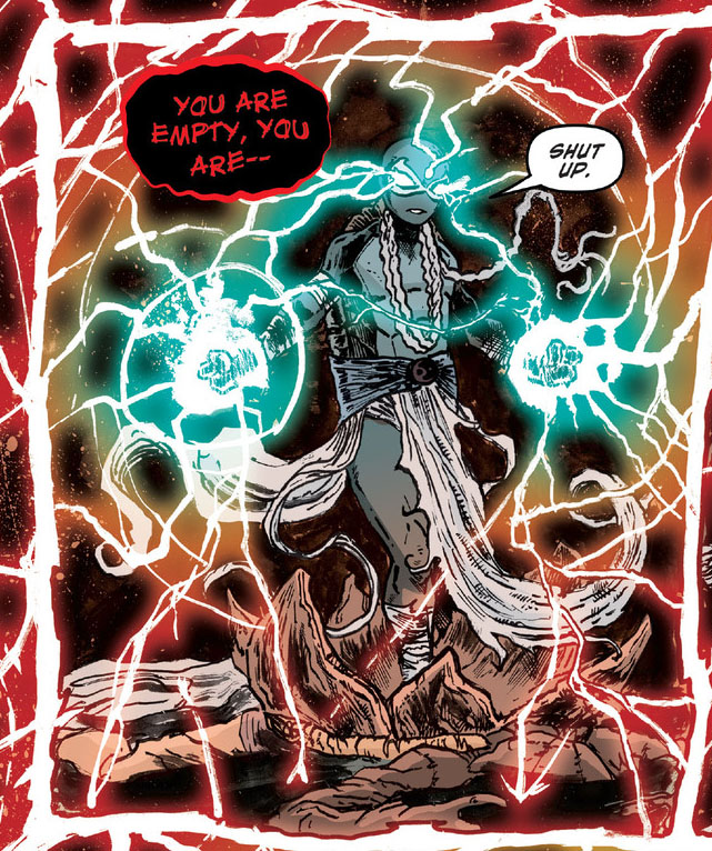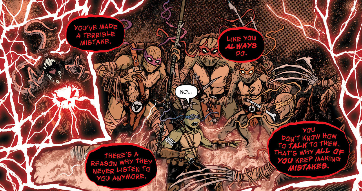Mais les trois groupes allaient devoir faire face à un ennemi inattendu. Des petits yeux rouges tapis dans l’ombre des corridors sombres. Leonardo vit soudainement sa bouche fondre jusqu’à obstruer toute ouverture. Ses frères, qui n’étaient pourtant pas avec lui, prenaient une forme monstrueuse dans son dos et lui reprochaient de faire toujours les mauvais choix. Les deux belettes à ses côtés partaient en direction de Old Hob. Mais au lieu de les accueillir les bras ouverts, le chat leur tournait le dos et s’en allait. Angel vivait elle aussi ses pires craintes. Celle de perdre son armure, qui lui donnait toute sa force au combat. Sans elle, que serait-elle ? Que vaudrait-elle ? Donatello se retrouvait violemment projeté dans son bureau, enseveli sous les notes et les livres. Une voix lui rappelait qu’il ne pouvait parler de ses recherches à ses frères. À ce stade, ce qu’il savait risquait de les détruire. Et pourtant, il devait évoquer les terribles secrets qu’il avait découverts. Koya et Bludgeon passaient eux aussi par cette épreuve psychologique démente. Une voix rappelait à Koya qu’elle était aussi isolée que faible. Bludgeon faisait face à ce qu’il refoulait depuis si longtemps. Son côté prédateur, lui rappelant qu’il ne pouvait éternellement enfouir sa vraie condition de tueur au fond de lui. Michelangelo faisait face à sa peur de perdre le monde qu’il s’était créé autour de lui sur les réseaux sociaux et son émission de radio. Et si tout cela avait fonctionné grâce à la révélation de Kitsune (TMNT #138) ? Venus était prise par cette voix lui rappelant l’aberration qu’elle était. Ce monstre hybride. Une enveloppe difforme l’entourait telle un cocon. Mais Venus, douée de ses pouvoirs, surmontait cette épreuve et sortait de cette peau abominable, comme une mue, et surmontait cette crainte. Elle cherchait Michelangelo autour d’elle, et suivant sa voix, le délivrait lui aussi de ses craintes. À l’aide de ses pouvoirs, elle enveloppait la tortue d’une aura protectrice. Venus ressentait au loin la puissance d’une écaille. Et même si elle n’était pas complète, elle demeurait puissante. Leurs compagnons avaient certainement succombés aux illusions. Il fallait les sortir de là.
