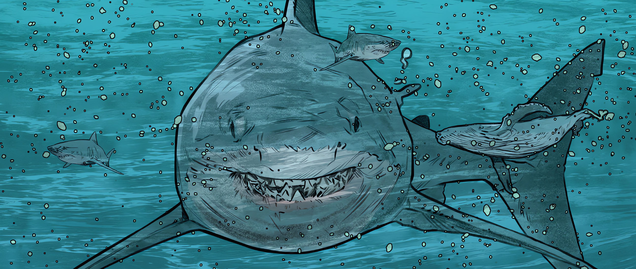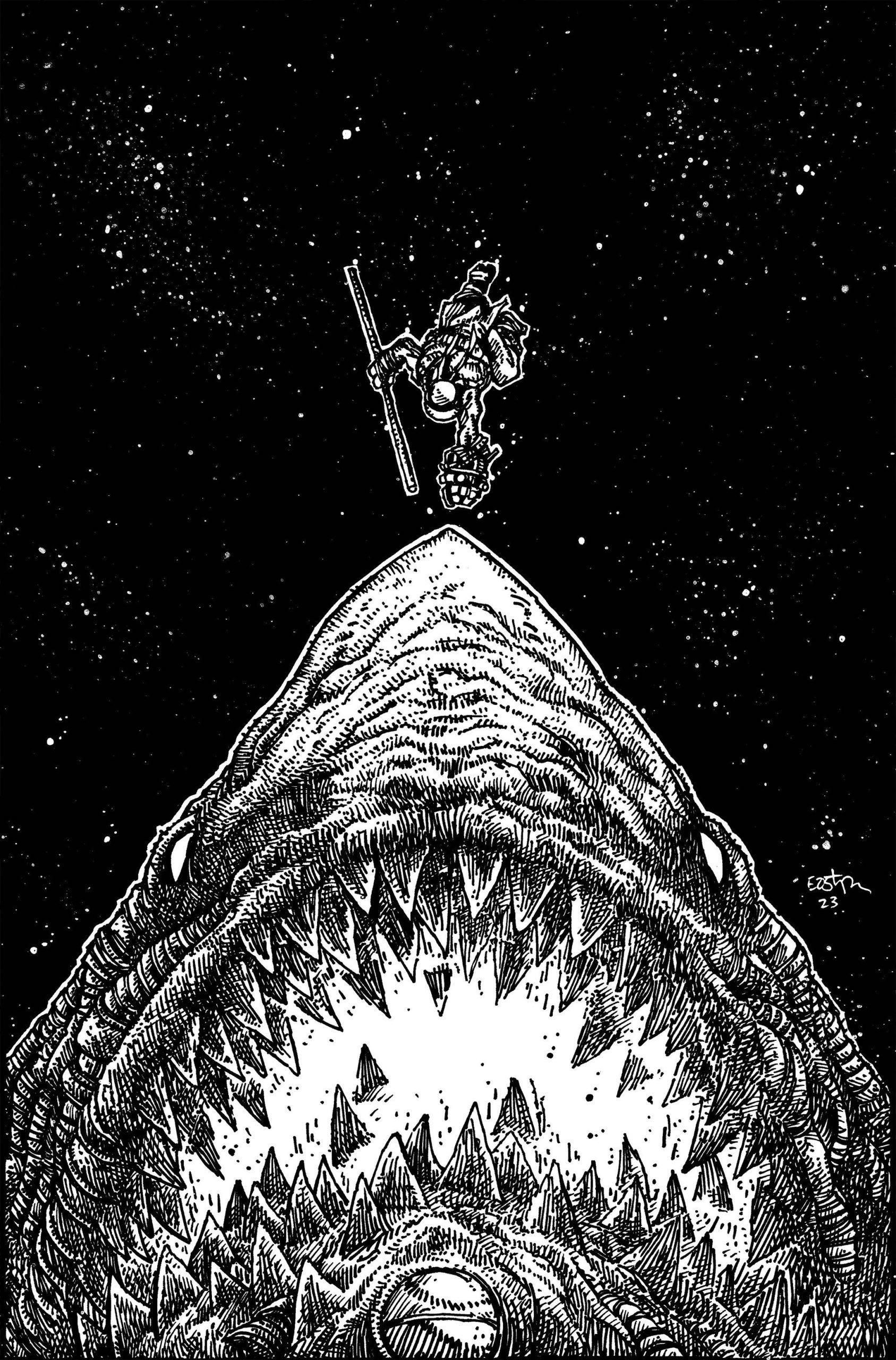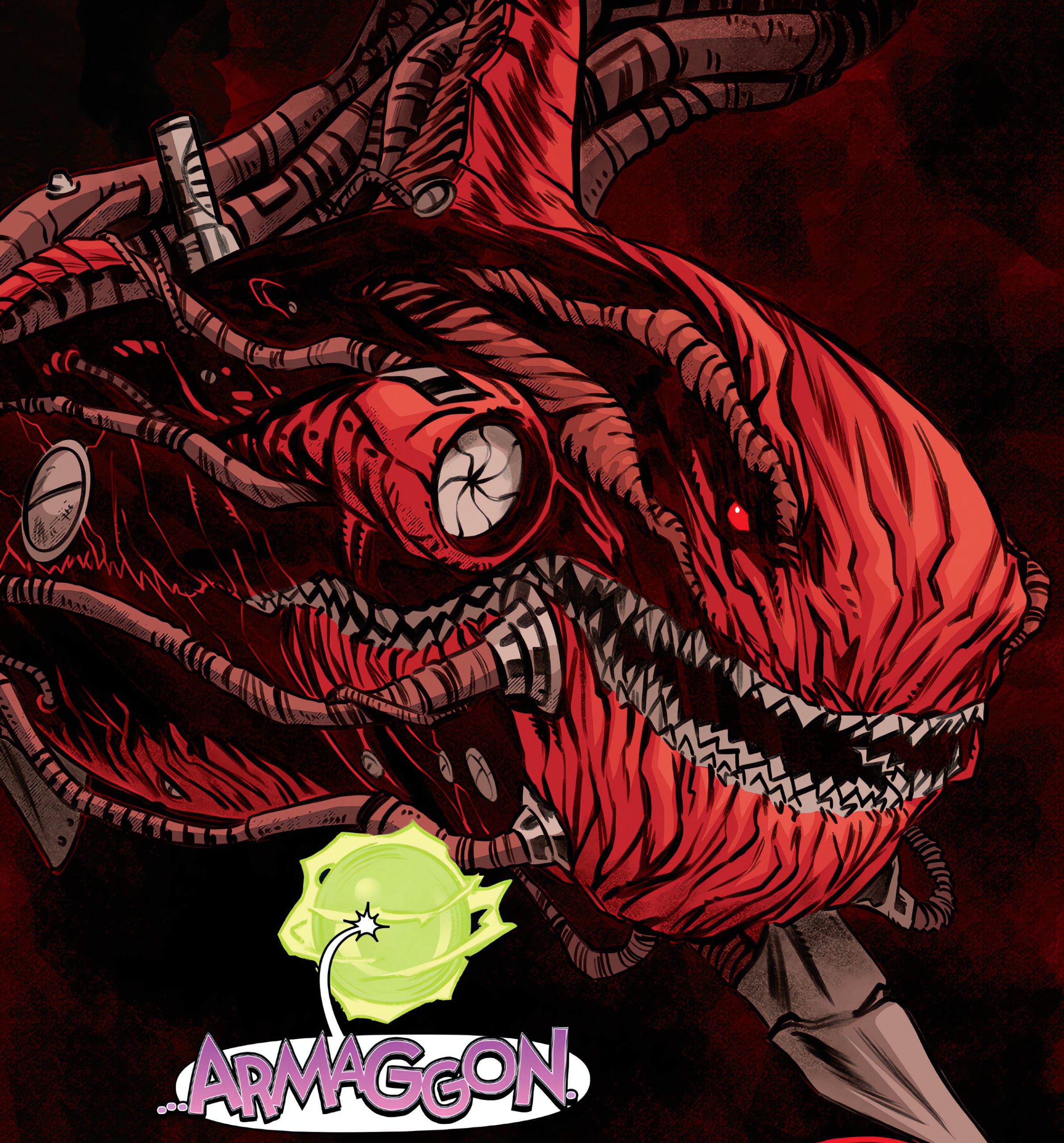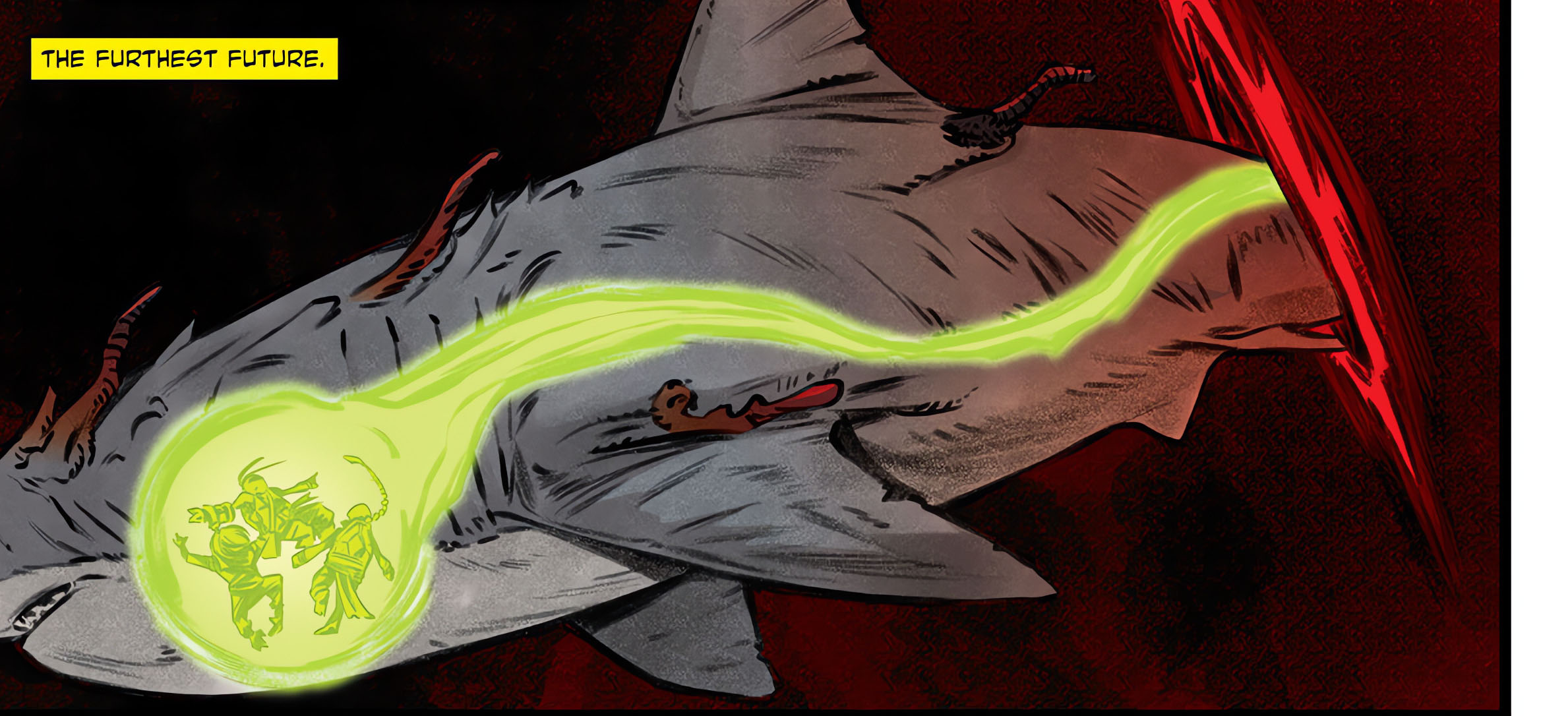 Donatello, Venus et Bob avaient été envoyés douze millions d’années dans le passé, durant le Serravalien. Même lieu. Mais un environnement totalement différent ! Northampton n’était alors qu’une île au milieu de l’océan. Les trois compagnons tombaient du ciel. Alors qu’ils s’apprêtaient à s’écraser dans l’eau, leur chute fut arrêtée. Ils lévitaient dans le ciel. Sous leurs pieds, une immense ombre s’avançait dans l’eau. Il s’agissait d’un mégalodon. Le poisson bondissait hors de l’eau pour s’emparer de ses proies. Donatello lui tirait dessus à l’aide de son gantelet anti-gravité. Venus lui prêtait main forte à l’aide de ses pouvoirs mais tous étaient de nouveau aspirés par le portail. Le requin y compris. Ils traversaient un nouveau couloir pour atterrir dans un lieu sombre. Durant son passage, le mégalodon commençait à se transformer mystérieusement, des lambeaux de chair sortaient de son corps telles des excroissances. Ne ressentant plus le moindre QNA, Venus se demandait s’ils ne se trouvaient pas à la fin de toute chose. Elle avait raison. Se retournant les tortues cherchaient du regard le requin, qui avait totalement changé d’apparence. Donatello le voyait avec effroi et le reconnaissait à présent. Cette monstruosité géante n’était autre qu’Armaggon. Et la tortue était à l’origine de sa transformation…