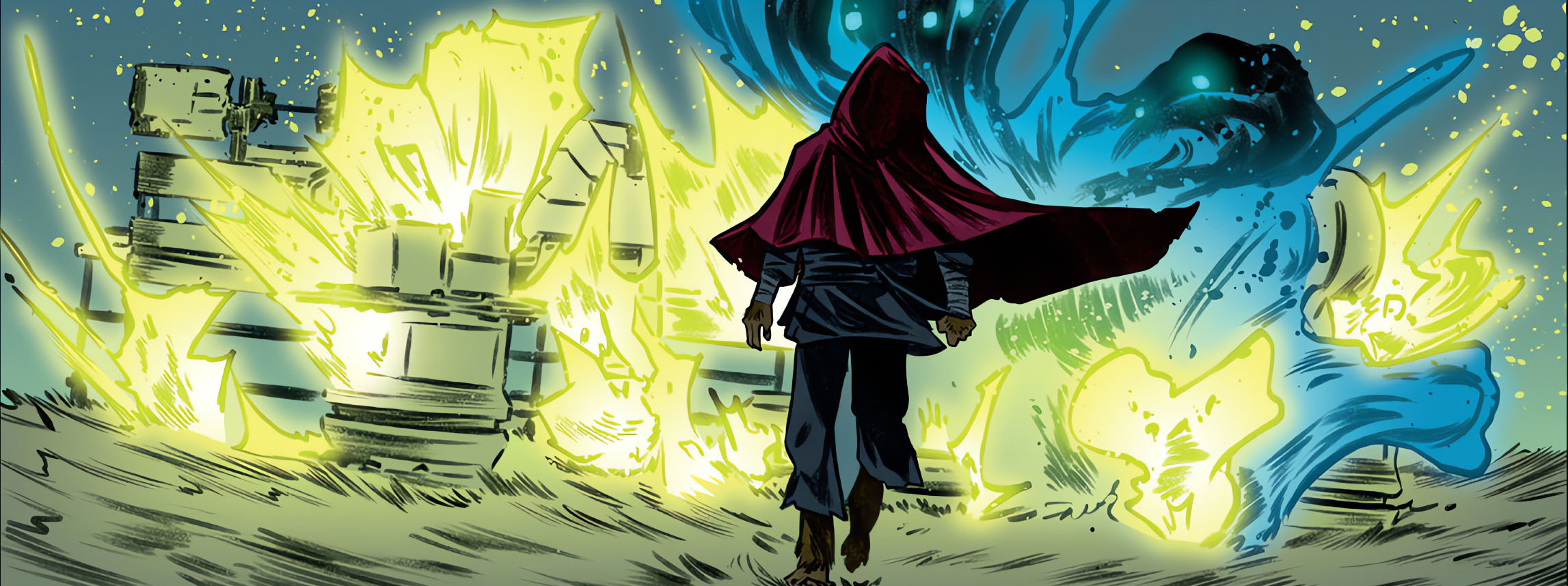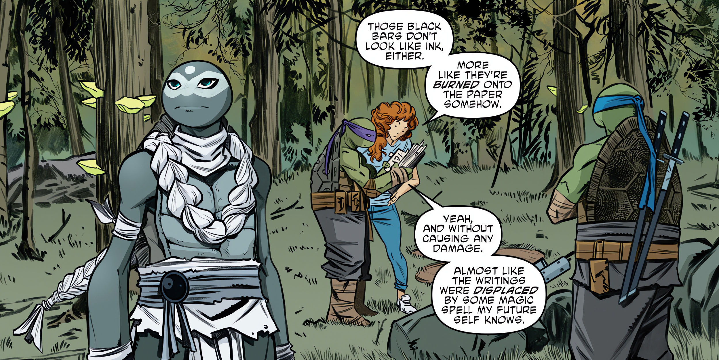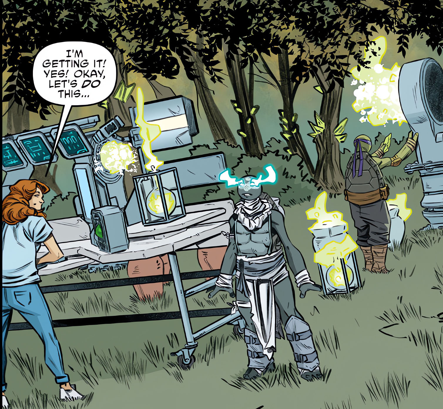 Dans la forêt mystérieuse de la thin place, les trois apprentis préparaient une énorme structure faite de cristaux et d’ordinateurs interconnectés. April ne savait pas trop où cela allait les mener. Elle était surtout surprise de voir Donatello basculer peu à peu vers quelque chose qui ressemblait à de la magie. Finalement, dans ce monde, science et magie n’étaient pas si éloignés. Les installations devaient permettre de créer un portail temporel qui les enverrait dans ce futur chaotique. La tortue espérait ainsi pouvoir s’entretenir avec son double et obtenir des réponses à ses questions. Savoir comment tout cela avait commencé. Et surtout comment l’en empêcher.