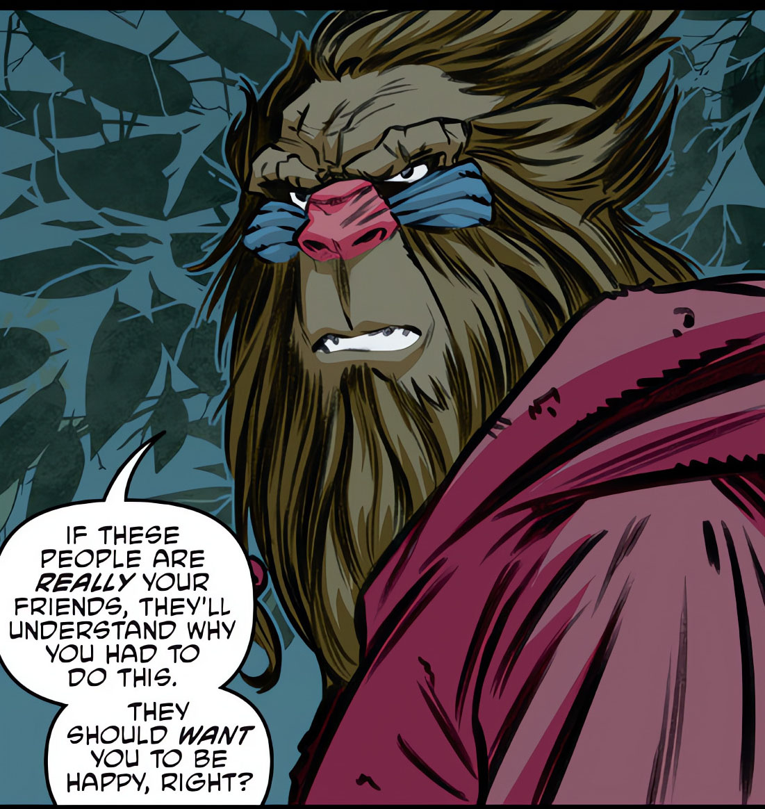 Tous partaient dormir. Mais en pleine nuit, une lueur rouge traversait la fenêtre de la chambre d’April et de Carmen, puis le mur mitoyen pour arriver dans la chambre des tortues. Là encore, elle passait son chemin jusqu’à arriver là où dormait Bob. Le filet de fumée prenait forme et réveillait le singe. Il s’agissait de sa propre version, venue du futur. Le simien tiré du réveil était naturellement surpris. Plus encore par ce qu’il allait apprendre. Dans le futur, Bob ne parviendrait pas à recouvrer sa forme humaine. Cet étrange singe du futur disait même qu’il savait comment inverser tout cela. Il connaissait quelqu’un qui parviendrait à empêcher sa mutation. Il lui tendait un petit appareil dans sa main et lui demandait de le suivre à l’extérieur. Tous deux s’engouffraient dans la forêt et parvenaient jusqu’aux installations des apprentis sorciers. Bob ne voulait pas trahir la tortue, qui lui semblait tout à fait correcte. Le Bob du futur employait les bons moyens pour convaincre son double du passé que ce qu’il faisait allait dans le bon sens. Finalement, le singe acceptait et s’employait à insérer le petit appareil dans les