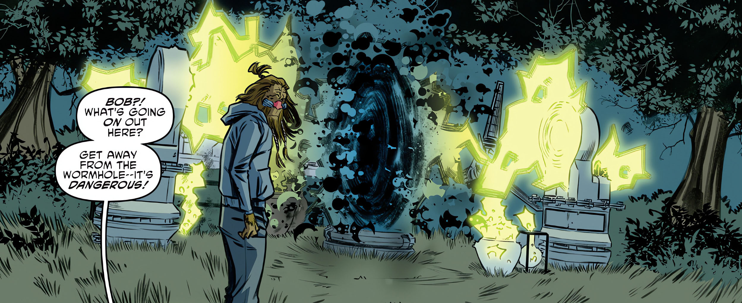 Sans perdre de temps, Donatello se ruait vers les machines pour les arrêter avant qu’elles ne surchauffent. Pendant ce temps, Venus essayait d’écarter Bob du lieu devenu trop dangereux. Mais le singe était retenu au même moment par son double du futur. Il le jetait à travers le portail. Venus avait à peine le temps d’esquiver une de ses attaques et d’appeler Donatello à l’aide. Le ninja se joignait à son amie. Cependant, il était très difficile de venir à bout du mandrill terriblement rapide et agile. Il jetait Venus à travers le portail, non sans lui injecter quelque chose dans son ADN en tendant le doigt vers elle. Formé par Leonardo, Bob savait exactement comment neutraliser l’autre tortue, qui passait à son tour le portail. Une fois les ennemis vaincus, le singe détruisait les machines et s’en allait dans l’obscurité de la forêt. April et Carmen étaient réveillées par les bruits et la lumière produite par les explosions des machines génératrices du portail.