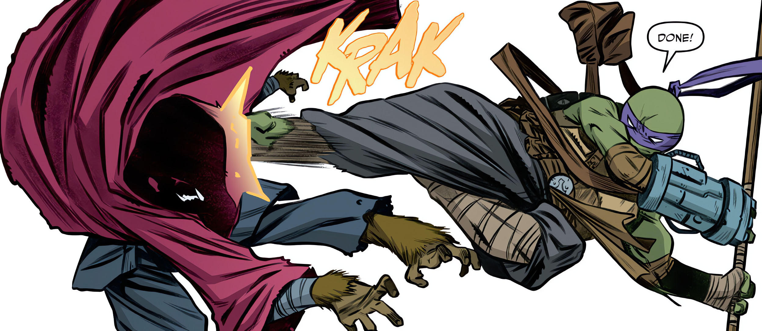 Le soir venu, Leonardo interrogeait Donatello sur sa décision de laisser leurs installations en place dans la thin place. La tortue n’était strictement pas inquiétée. Personne ne viendrait. Il était surtout plongé dans ses pensées, focalisé sur la suite des expériences. Donatello s’en voulait de n’avoir rien dit plus tôt concernant Armaggon. Il avait le sentiment que leur famille avait éclaté par sa faute (TMNT #142). Et que l’avenir était entre ses mains. Leonardo cherchait à le rassurer, lui rappelant que toutes friteries finissaient par se séparer pour que chacun puisse suivre sa propre voie. Mais le génie n’était pas de cet avis. Il repensait surtout à ce que la Lita du futur leur avait dit. C’était de cette manière que tout avait commencé dans sa temporalité (TMNT #116).
