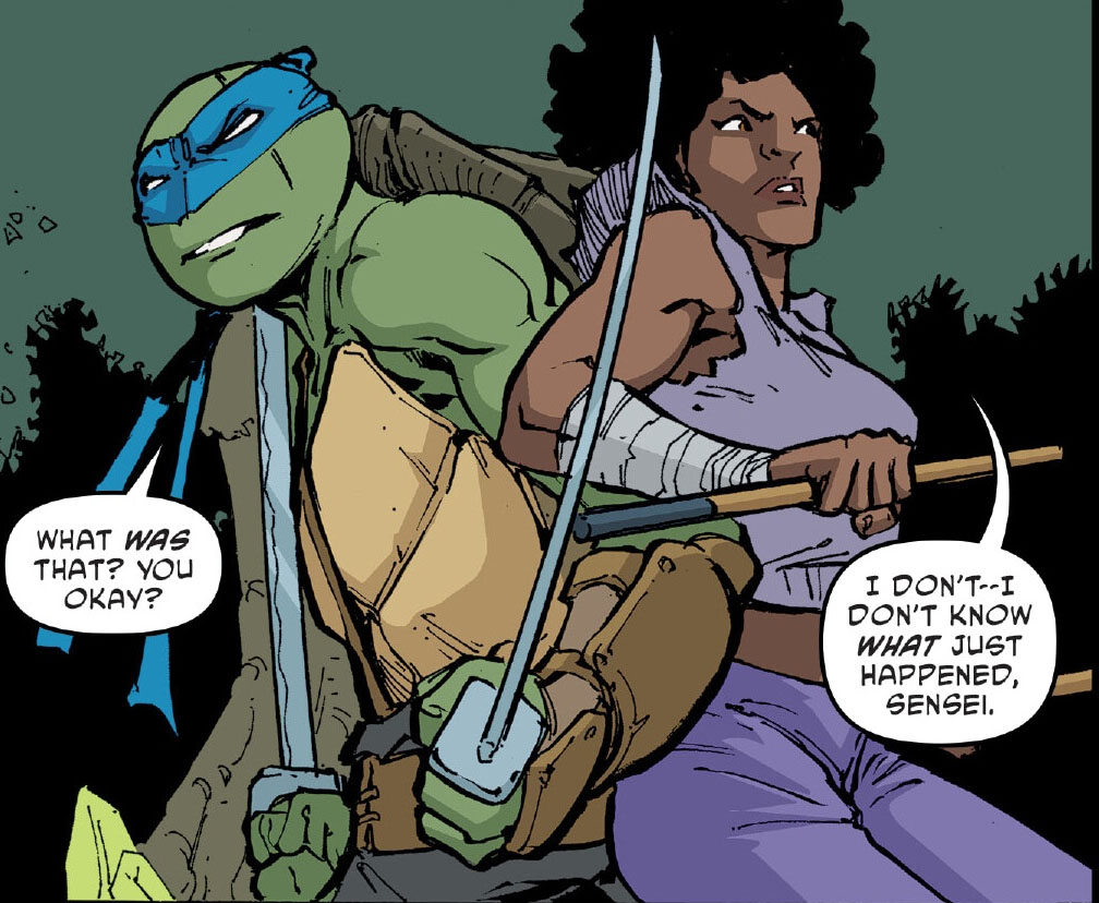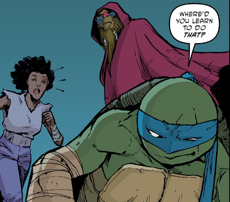 Si jamais une des créatures venait à réapparaître aux abords de la maison, Leonardo voulait que ses disciples soient prêts et leur proposait de reprendre leur entraînement dans le jardin. Mais contre toute attente, Bob renversait son sensei lors de la première démonstration. Jamais la tortue ne lui avait enseigné pareil mouvement ! Pas encore. Le singe cachait toujours son visage derrière cette étrange capuche, à l’image de son mutisme…