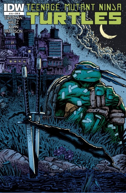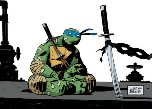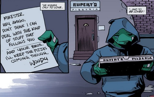 Le lendemain, Casey et April aidaient les tortues à ranger un petit peu l’abri pour leur prochaine installation. Leonardo faisait comme si tout allait bien, alors qu’il n’en était rien. La tortue s’était cloitrée dans les niveaux inférieurs du bunker tandis que ses frères arrangeaient les parties de vie. Son sabre était planté au sol face à lui. Leonardo fixait le bandeau noir de Slash qui y était noué. Il avait déjà recherché des preuves de sa survie à de nombreuses reprises, en vain. Michelangelo était quant à lui parti silencieusement chercher des pizzas. Cette histoire l’avait remué. Le cœur tendre espérait une meilleure fin à ce combat, comme tout le monde. Devant la pizzeria de Rupert, l’adolescent ramassait une boîte qui lui était destinée ainsi qu’un message de Woody. Le pizzaiolo y disait qu’il continuerait à leur fournir les pizzas. En revanche, il ne voulait plus être confronté à leurs histoires.