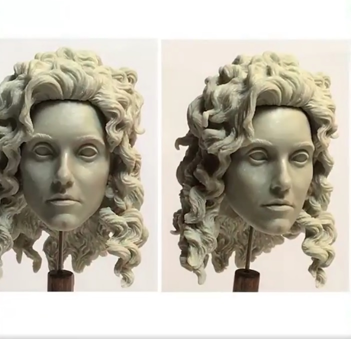 Les cheveux sont peints en brun clair et brossés à sec par une peinture brune/jaune mettant en valeur les reliefs de sa chevelure so 80’s. Derrière les cheveux, on peut voir des boucles d’oreilles, elles aussi peintes en doré.