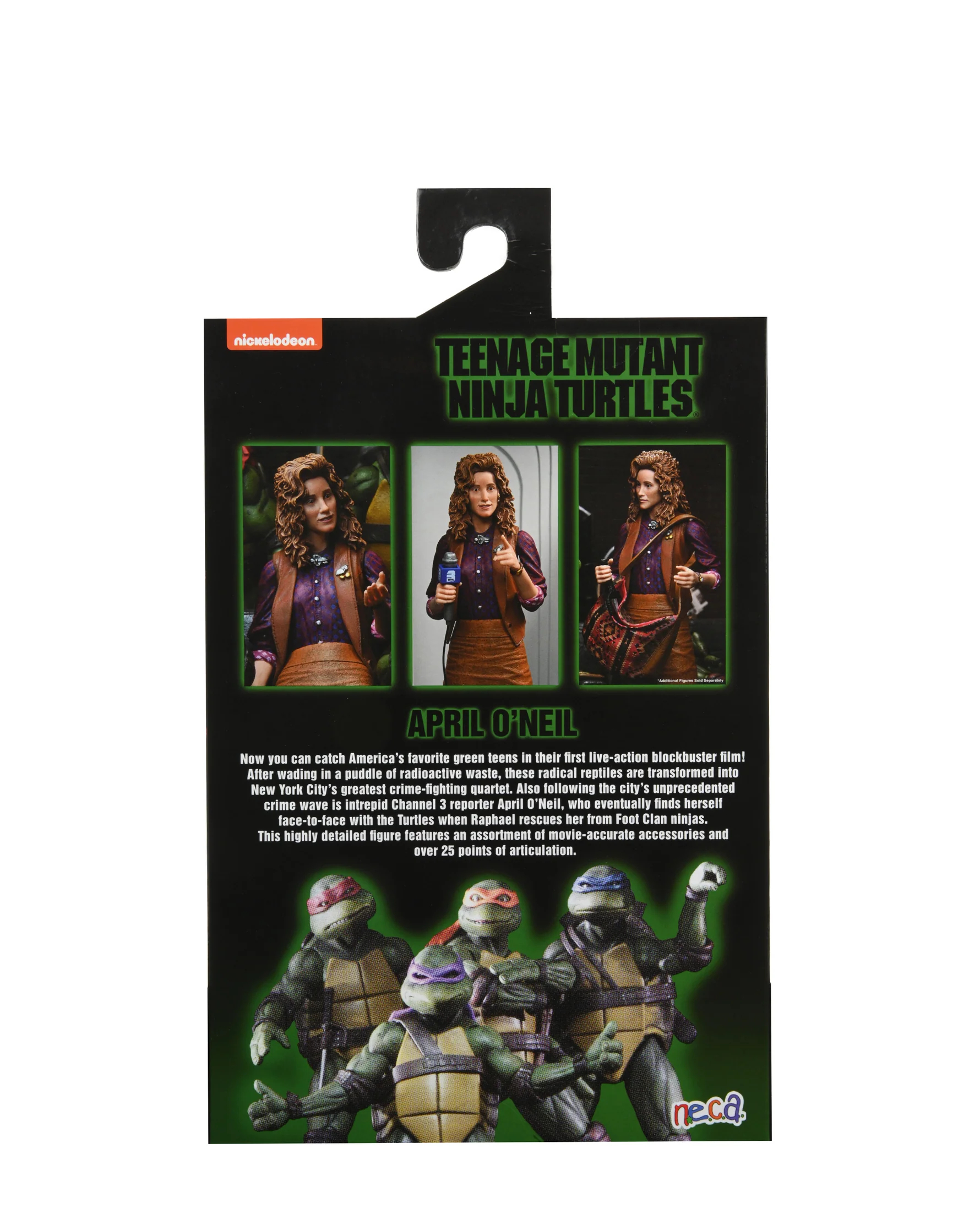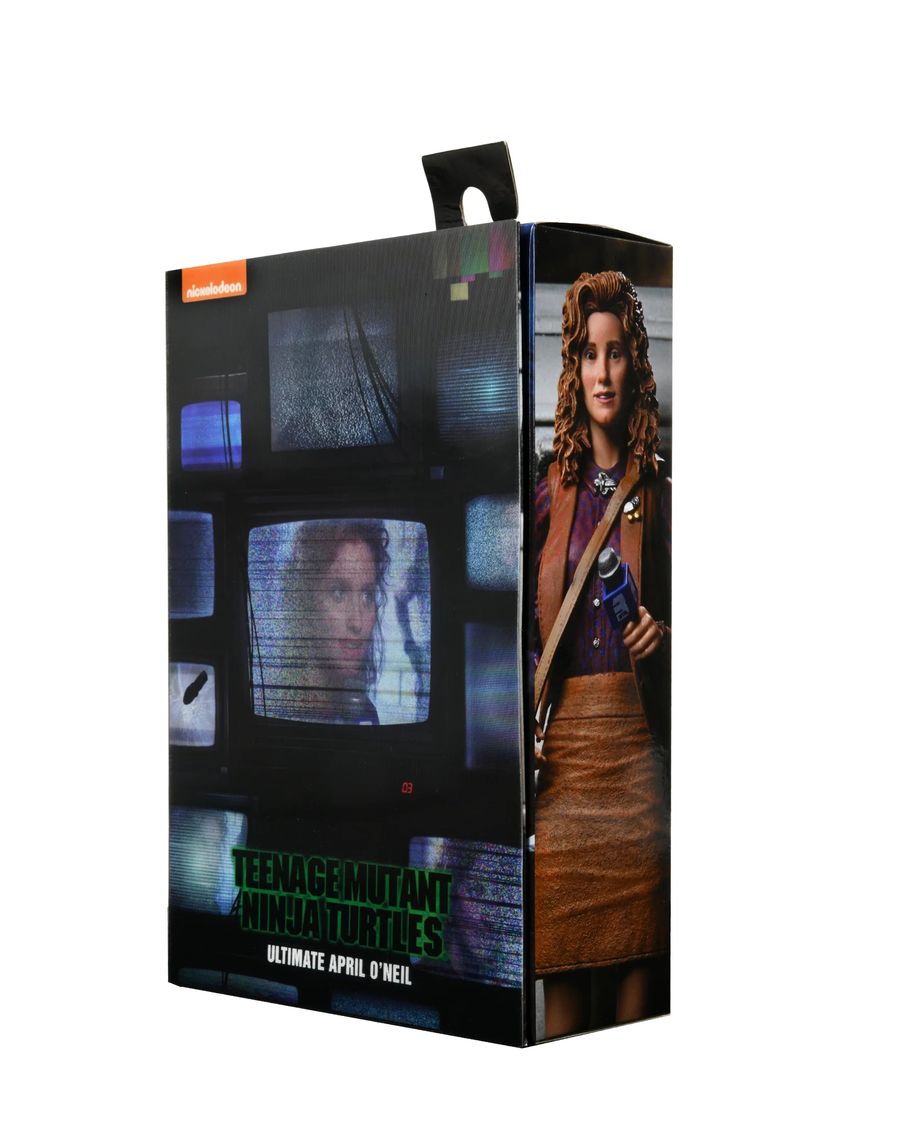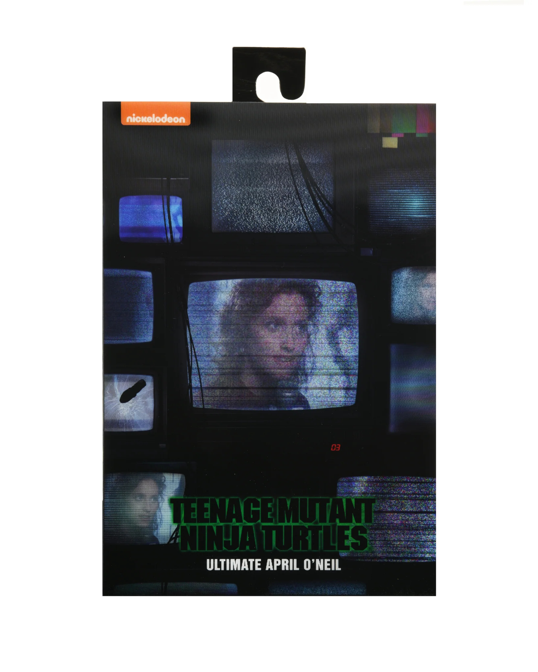 L’illustration à l’avant du blister est une image collée. Cette illustration est faite dans une carte lenticulaire qui bouge en fonction de l’orientation de la lumière. On y voit April tenant une interview à travers plusieurs postes de télévision. Bouger le blister permet de donner l’illusion que la télévision capte ou ne capte pas la chaîne, avec un effet de mouchetage à l’image. C’est valable pour tous les écrans de télévision du blister et pas uniquement le central. On retrouve d’ailleurs le petit kunai lancé par Shredder sur un de ses postes, lorsque la journaliste révèle ses soupçons sur le Foot Clan.